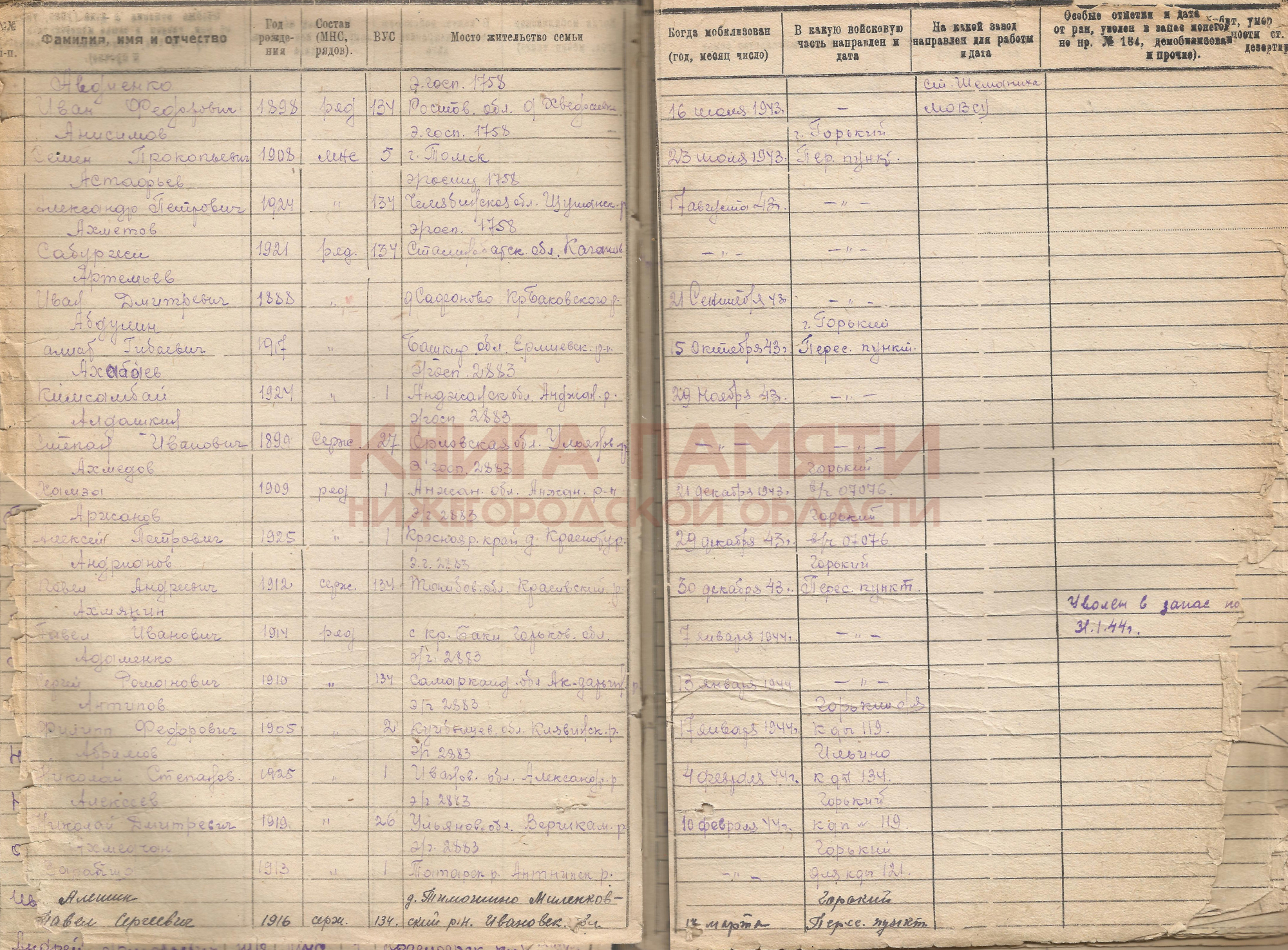 Из эвакогоспиталя 2883 (п. Красные Баки) был направлен Краснобаковским РВК 10 февраля 1944 г. в г. Горький для команды 121