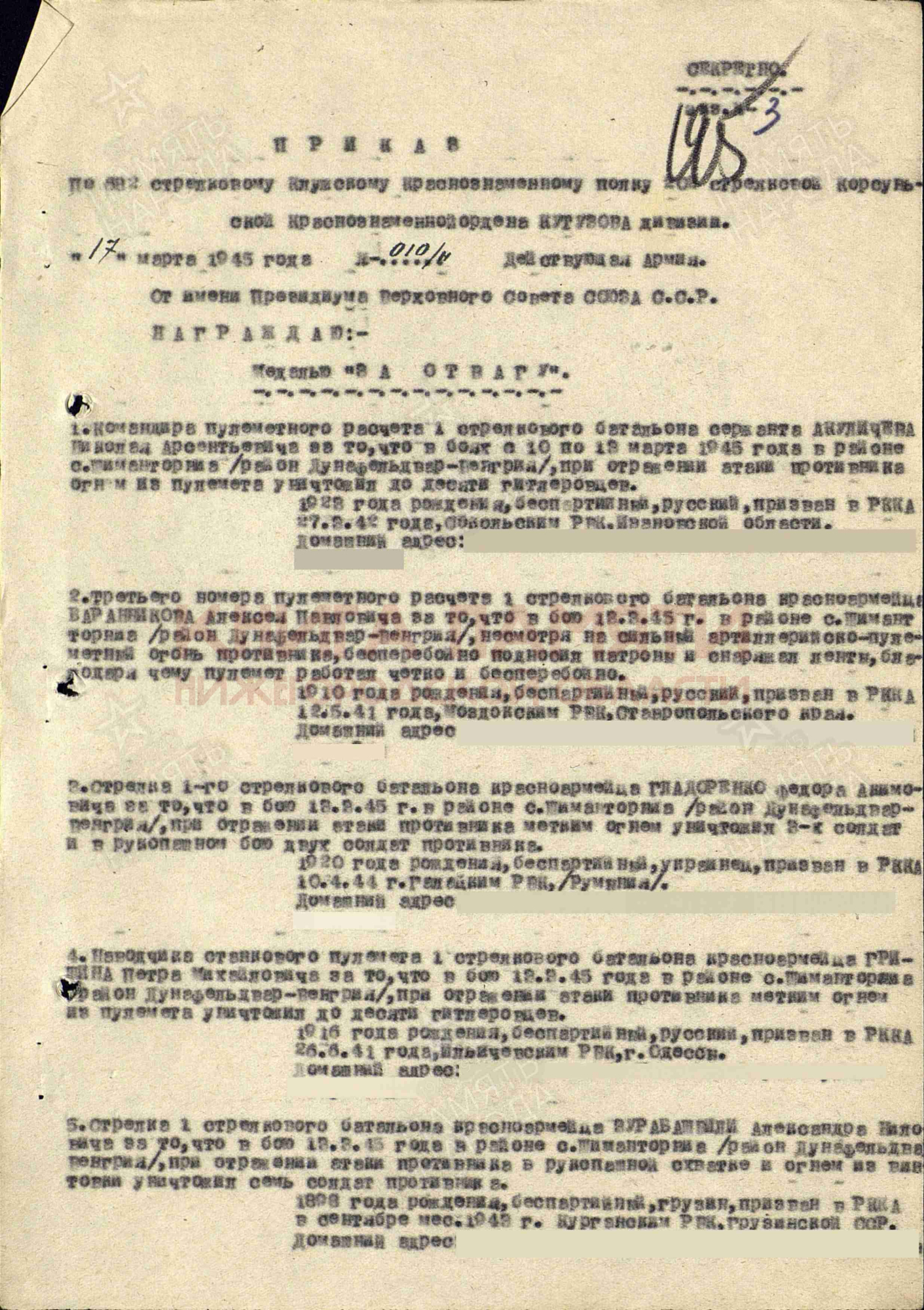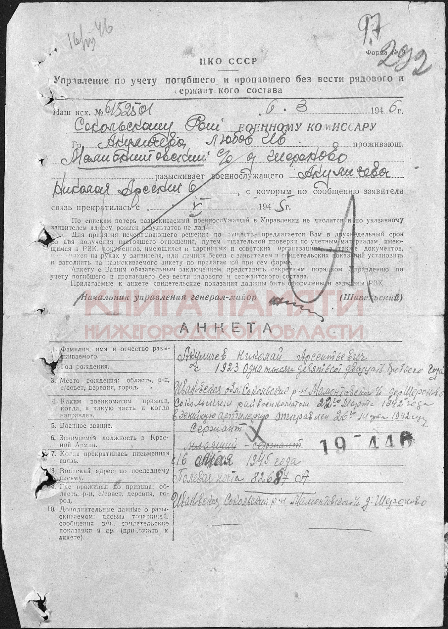 Место призыва: Сокольский РВК, Ивановская обл., Сокольский р-н