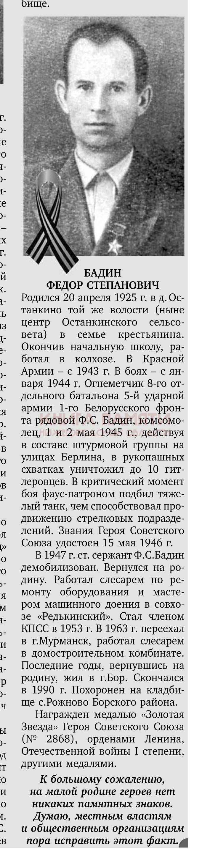 В 1938 году окончил 5 классов Останкинской неполной средней школы и с апреля 1938 года работал сапожником в артели «Кооператор» в г. Бор Горьковской области. С октября по декабрь 1939 г по вечерам посещал курсы трактористов при Рожновской МТС в Останкино. В декабре 1939 г Бадин Ф.С. поступил в ремесленное училище №17 при заводе «40 лет Октября» Борского района, одновременно закончил 6 и 7 класс средней школы, стал судорулевым. Уже шла война и работать на пароходе ему не пришлось. После окончания училища в декабре 1941 года работал столяром на заводе №21 в г. Горьком. В ноябре 1942 г был призван отец и по его просьбе Федор вернулся домой: остался за старшего, помогал матери, работал в колхозе «Борец за свободу» летом на сенокосе и уборке зерна, зимой на ферме. Но в 1942 г он совершил проступок, за который судим по ст. УК и осужден на 3 месяца заключения. Так как время было военное, это могли быть и опоздание на работу и взятые с поля, оставшиеся на земле овощи или зерно. Призван в январе 1943 года Борским РВК, попал в 1-ю воздушно-десантную бригаду, где его определили сапожником. В июне 1943 г его перевели в 10-ю учебную бригаду с той же специальностью, где он прослужил до января 1944 г. 12.01.1944 призван Гороховецким РВК, а 15.01.44 Бадина Ф.С. направили в Гороховецкие лагеря. 17.01.1944 г. рядового Бадина Ф.С. перевели в 354 запасной курсантский стрелковый полк в г. Владимир, где он получил специальность огнеметчика, а 27.01.1944 он отправлен на Северо-Западный фронт, под Ленинград. Боевое крещение получил в январе 1944 при прорыве блокады Ленинграда, в бою под Лугой получил ранение осколками разорвавшейся мины. После госпиталя в составе 8-го отдельного огнеметного батальона 5 УА Белорусского? 3 Прибалтийского фронта освобождал Псков, Тарту, Ригу. В первых числах февраля 1945 г бойцы-огнеметчики 8-го огнеметного батальона форсировали реку Одер в районе Кюстрина и в течение продолжительного времени удерживали захваченный плацдарм. От Кюстрина до Берлина не более 70 км и до середины февраля фашисты делали все, чтобы превратить Кюстринский плацдарм в непреодолимую преграду. Ежедневно они предпринимали до десятка контратак, чтобы отбросить советские войска за Одер. 8-й отдельный огнеметный батальон был в числе первых переправившихся за Одер подразделений. На огнеметной позиции обычно устанавливали 5-6 огнеметов, расчет состоял из 2 бойцов. Огнеметы старались установить максимально близко к немецким окопам (не более 100 м), т.к. такова дальность поражения огнемета. Обустраивали свои позиции глубокой ночью, чтобы застать врага врасплох. Работали тихо, опасаясь фашистских снайперов и разведчиков. Задачи перед огнеметчиками ставились жесткие: после артподготовки направленной струей огня выжигать фашистов с укрепленных позиций, уничтожать ДОТы и ДЗОТы, способствуя продвижению нашей пехоты. С марта 1945 г 1 Белорусский фронт. 21 апреля 1945 г части подошли к пригородам Берлина и начали штурм города. В битве за Берлин участвовало несколько батальонов фугасных огнеметов (ФОГ). Особо отличился рядовой 8-го ооб ФОГ Бадин Ф.С. -01.05.45, действуя в составе штурмовой группы, после того, как огнеметами был подожжен дом, он первый ворвался в него, вовлекая стрелков роты на штурм. В рукопашной схватке убил 4-х немцев. В этот же день, когда танк «пантера» подошел вплотную к боевым порядкам батальона, Бадин подполз к нему и ф