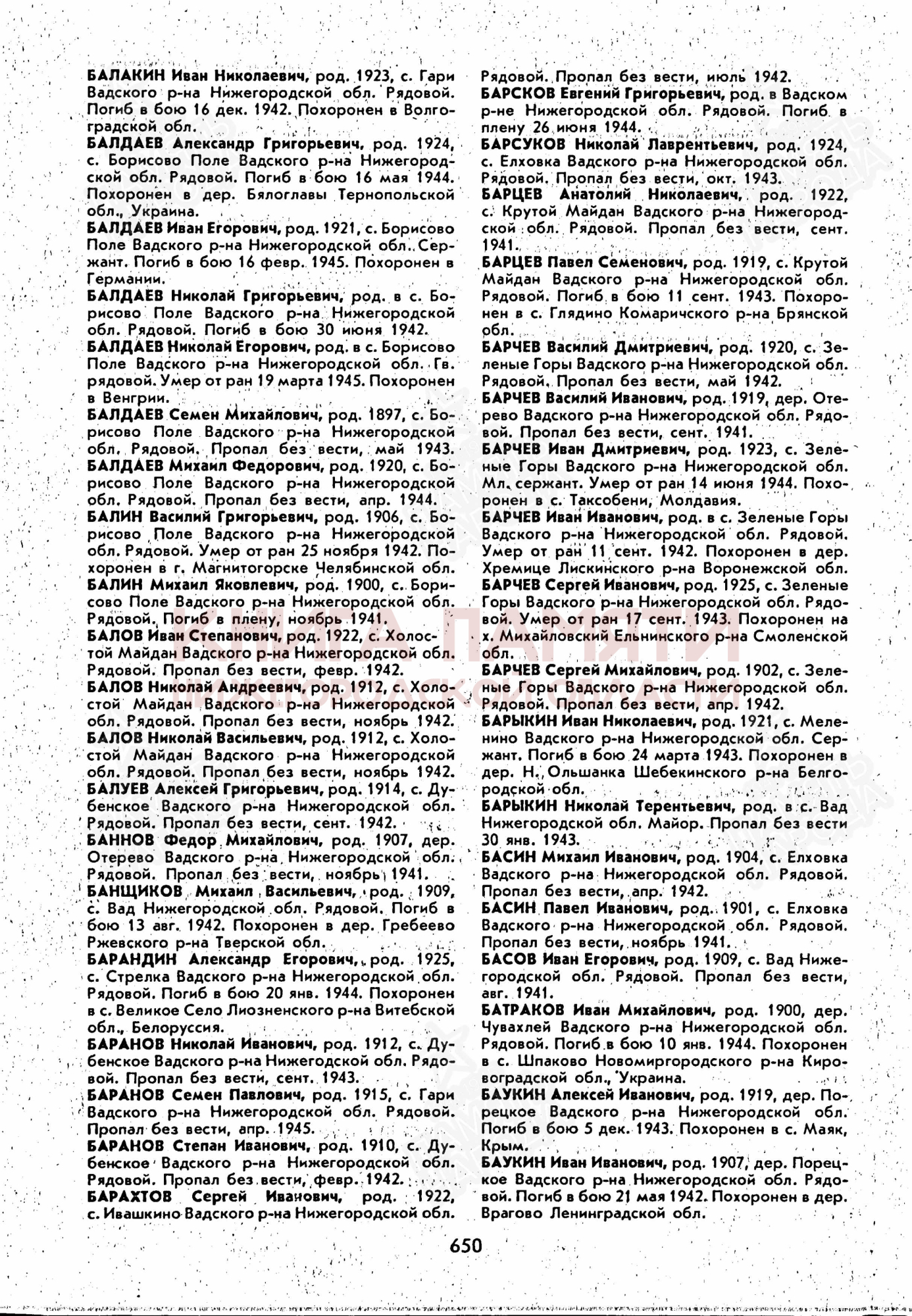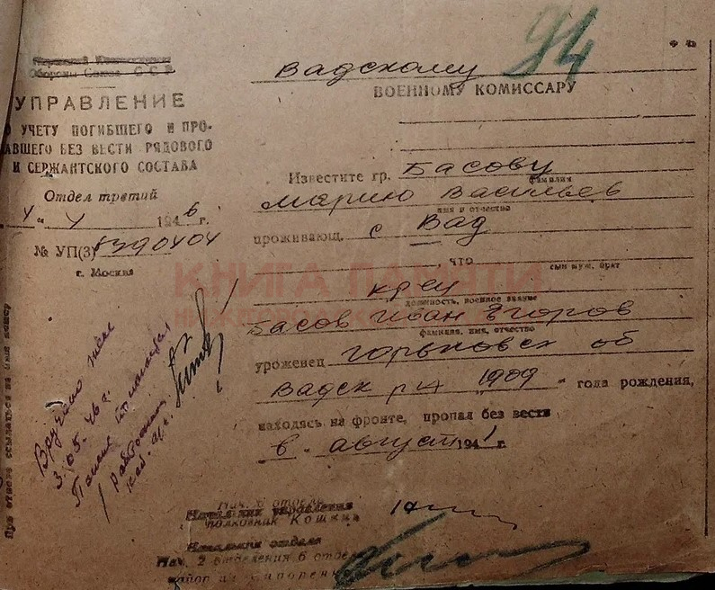 «Книга памяти» воинов уроженцев Вадского района напротив фамилии Ивана Егоровича Басова значится: «Пропал без вести в августе 1941 г.».