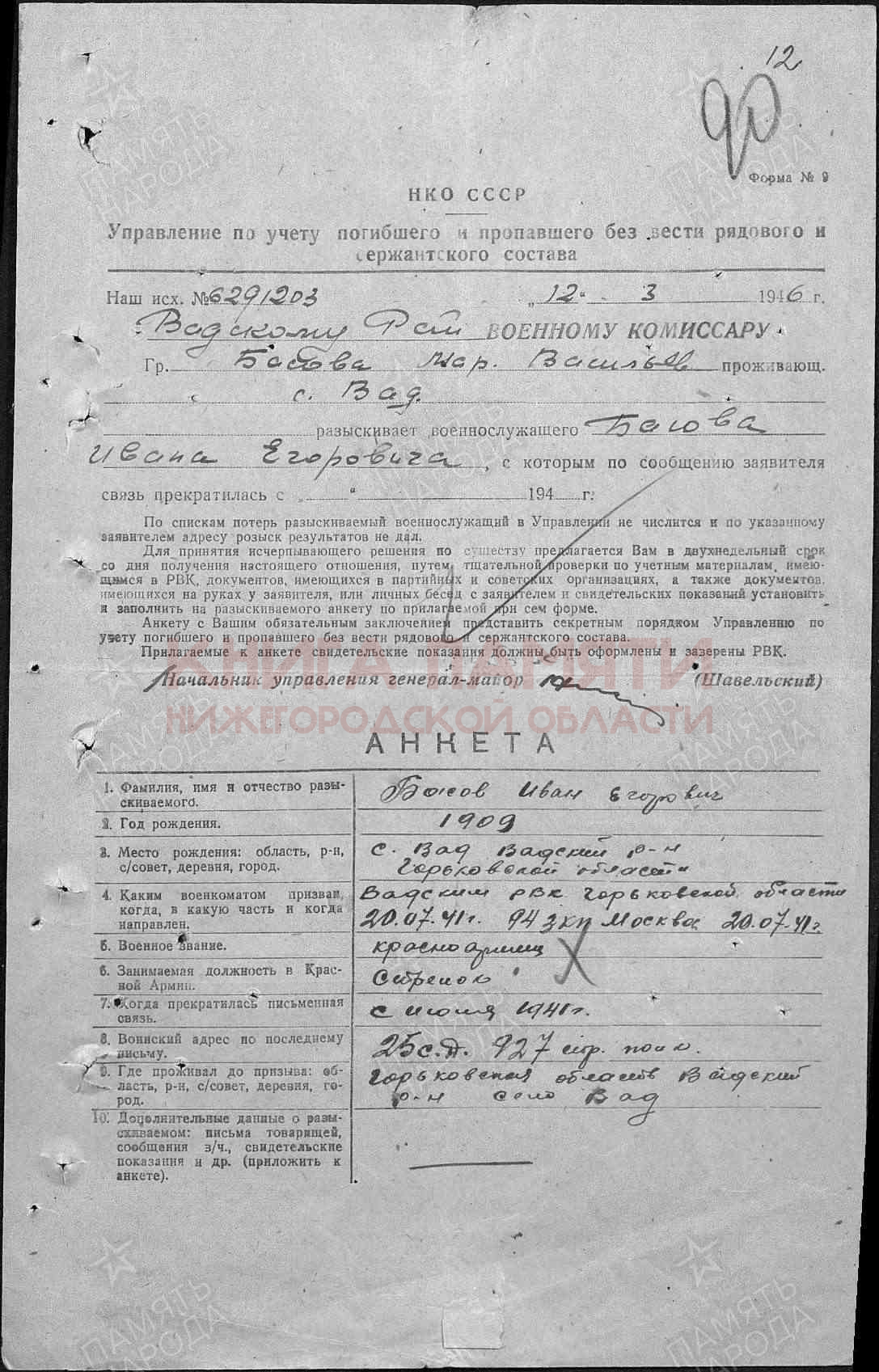 Иван Егорович (или, по документам, Георгиевич) родился в 1909 г. в селе Вад. На войну призван Вадским райвоенкоматом 20 июля 1941 г. К началу войны он был женат, в семье воспитывалось пятеро детей. Старшей дочери, Антонине, исполнилось 12 лет‚ а младшей, Вале, всего полгода. Сыновьям Юрию, Николаю и Сергею - было всего 9, 8 лет и 3 года. Глава семьи до войны работал кладовщиком в сельпо. Жена Мария Васильевна в колхозе. Перед самой войной семью постигла беда - сгорел дом. Поэтому Иван Егорович нанялся в пастухи, чтобы побольше заработать. Чтобы купить дом, был продан весь домашний скот. Мария Васильевна получила от