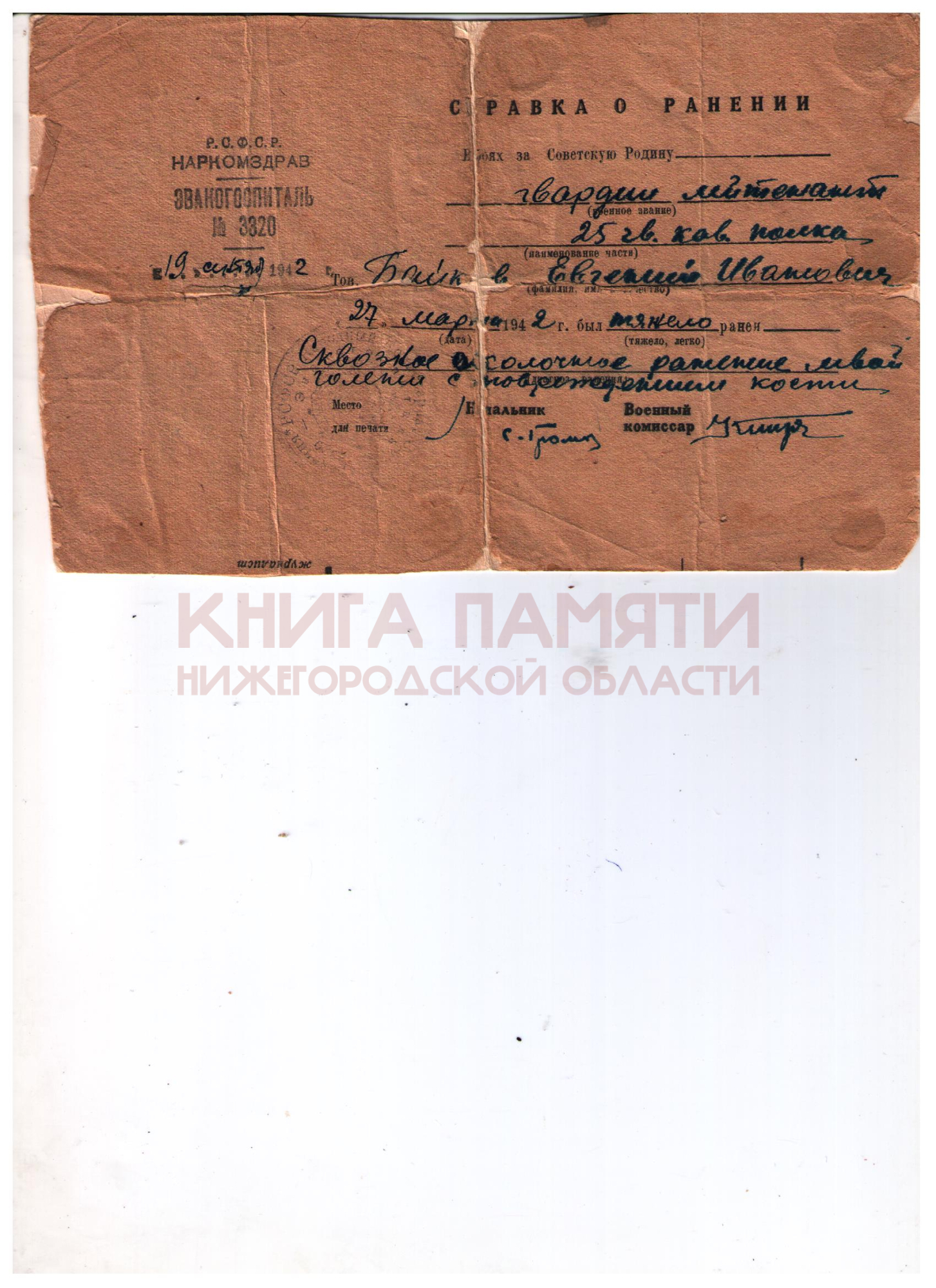 27 марта 1942 г. был тяжело ранен - получил сквозное ранение левой голени с повреждением кости. Был кровопролитный бой, заряды рвались безостановочно, свер у бомбили. В госпитале пролежал 6 месяцев. До конца войны служил на более легкой службе.