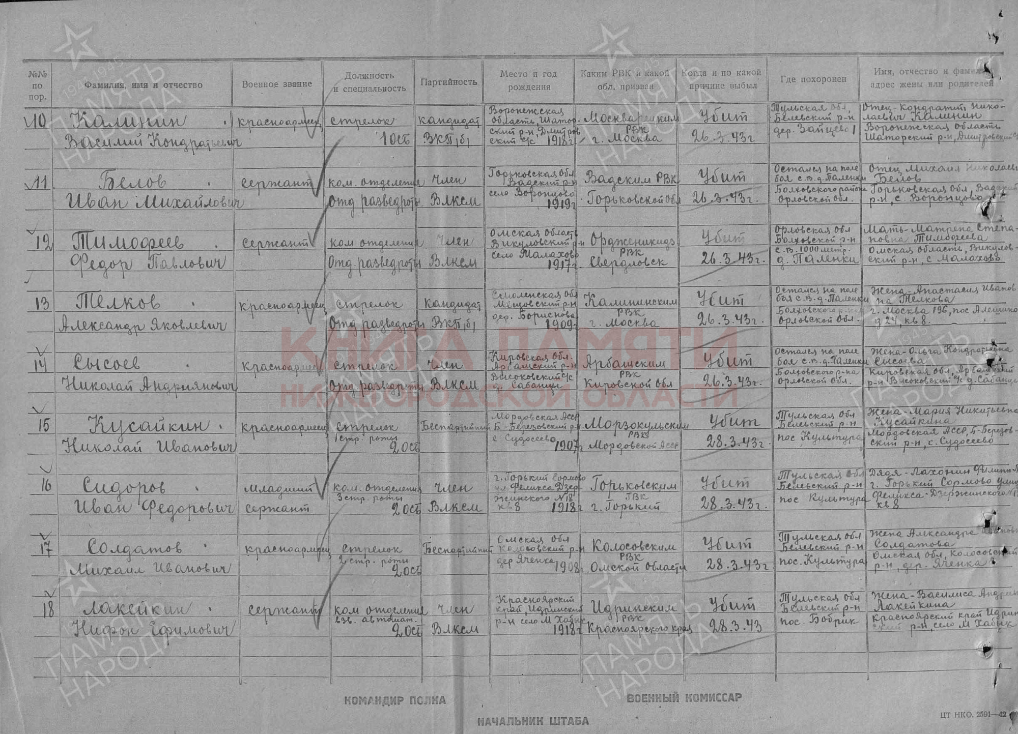 Место выбытия: Орловская обл., Болховский р-н, д. Паленки, северо-восточнее. Место захоронения: Орловская обл., Волховский р-н, с. Палецки.