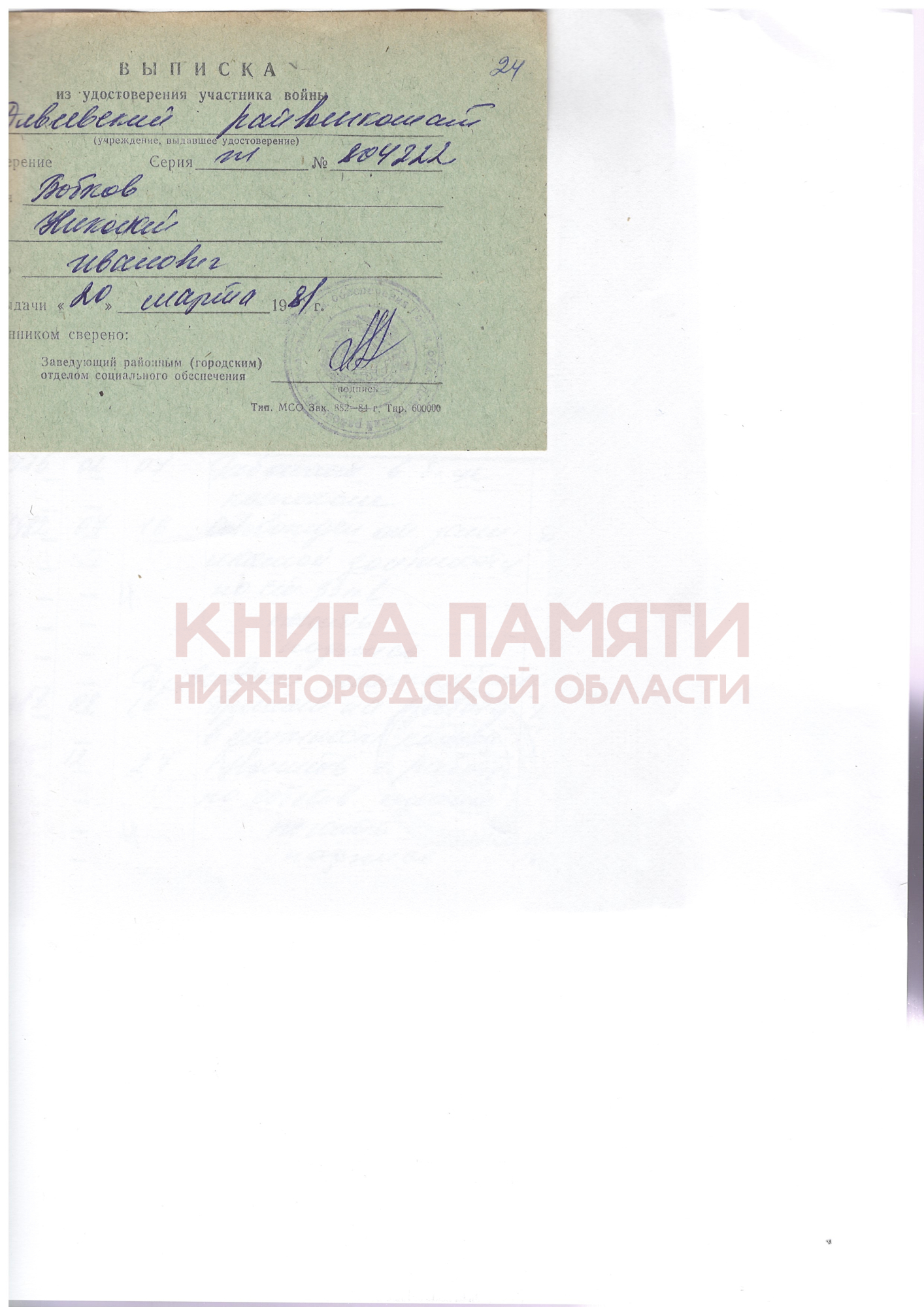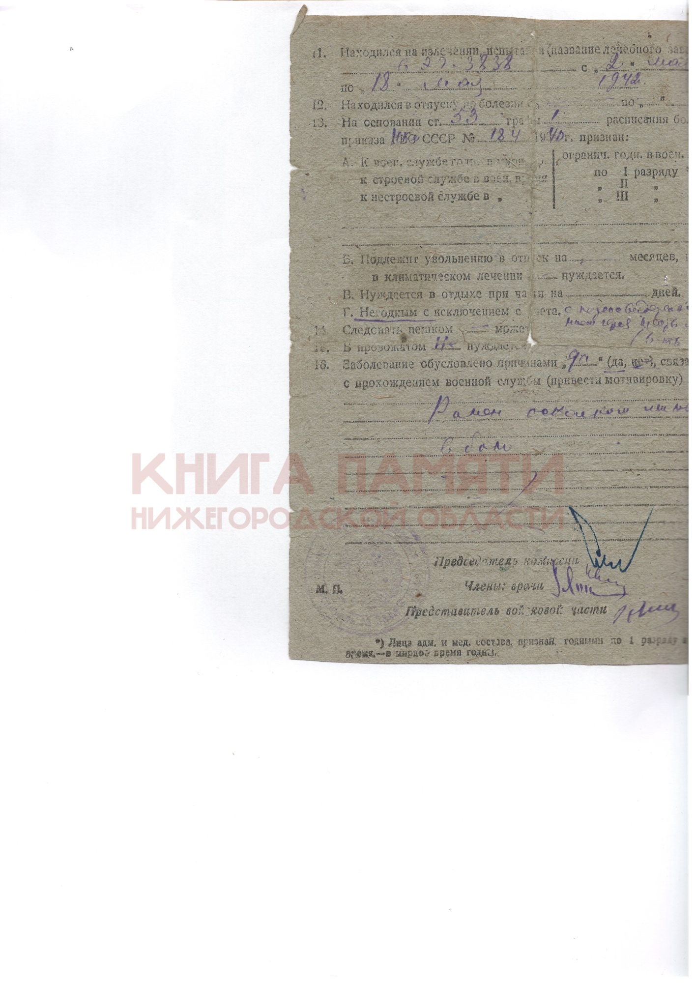 Инвалид ВОВ 2 группы, был ранен в плечо, находился на излечении в ЭГ 3838 с 02.05.1942г. по 18.05.1942г. Проживал в д.Осиновка Дивеевского района. Умер 01.04.2004г.