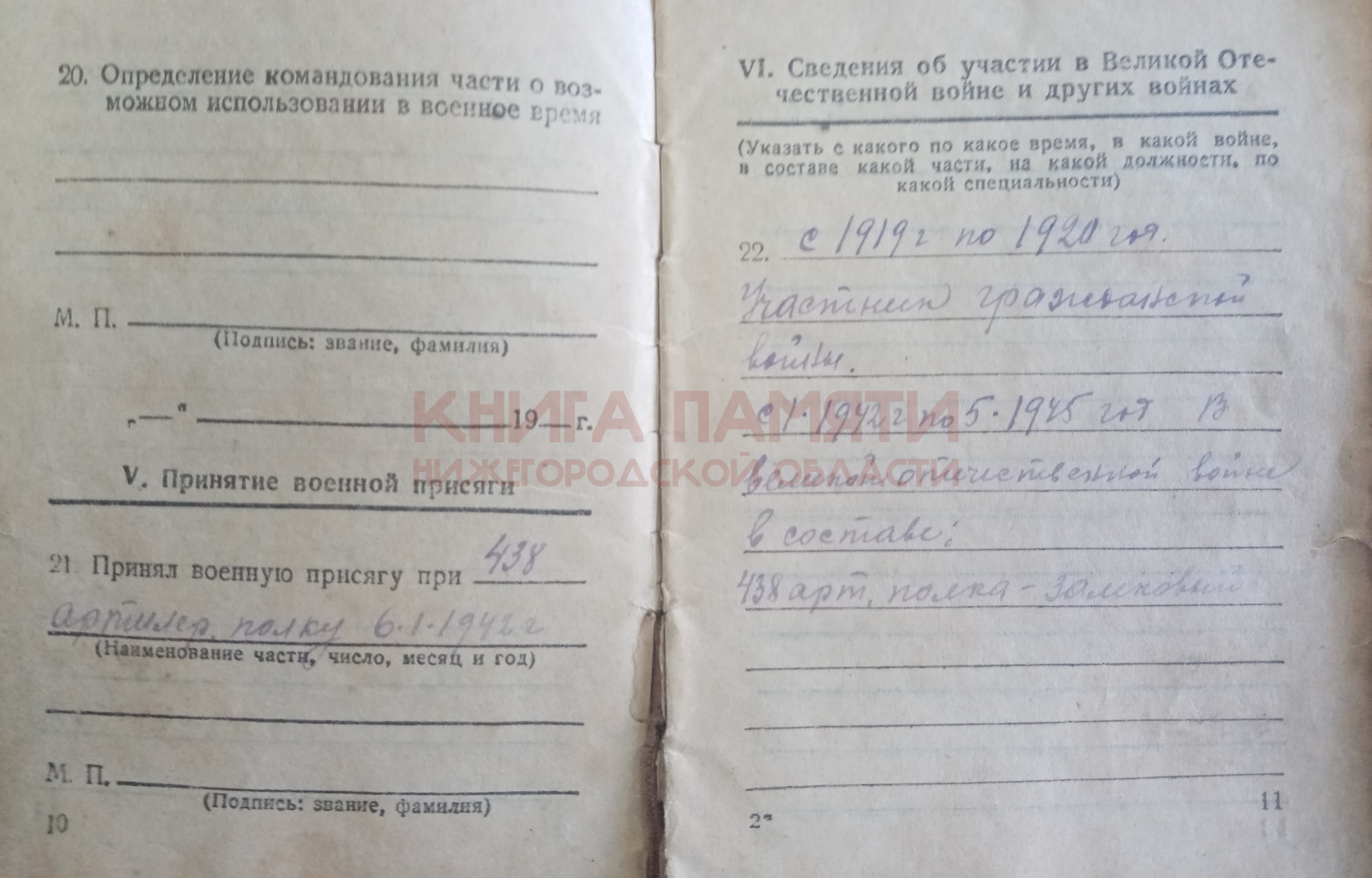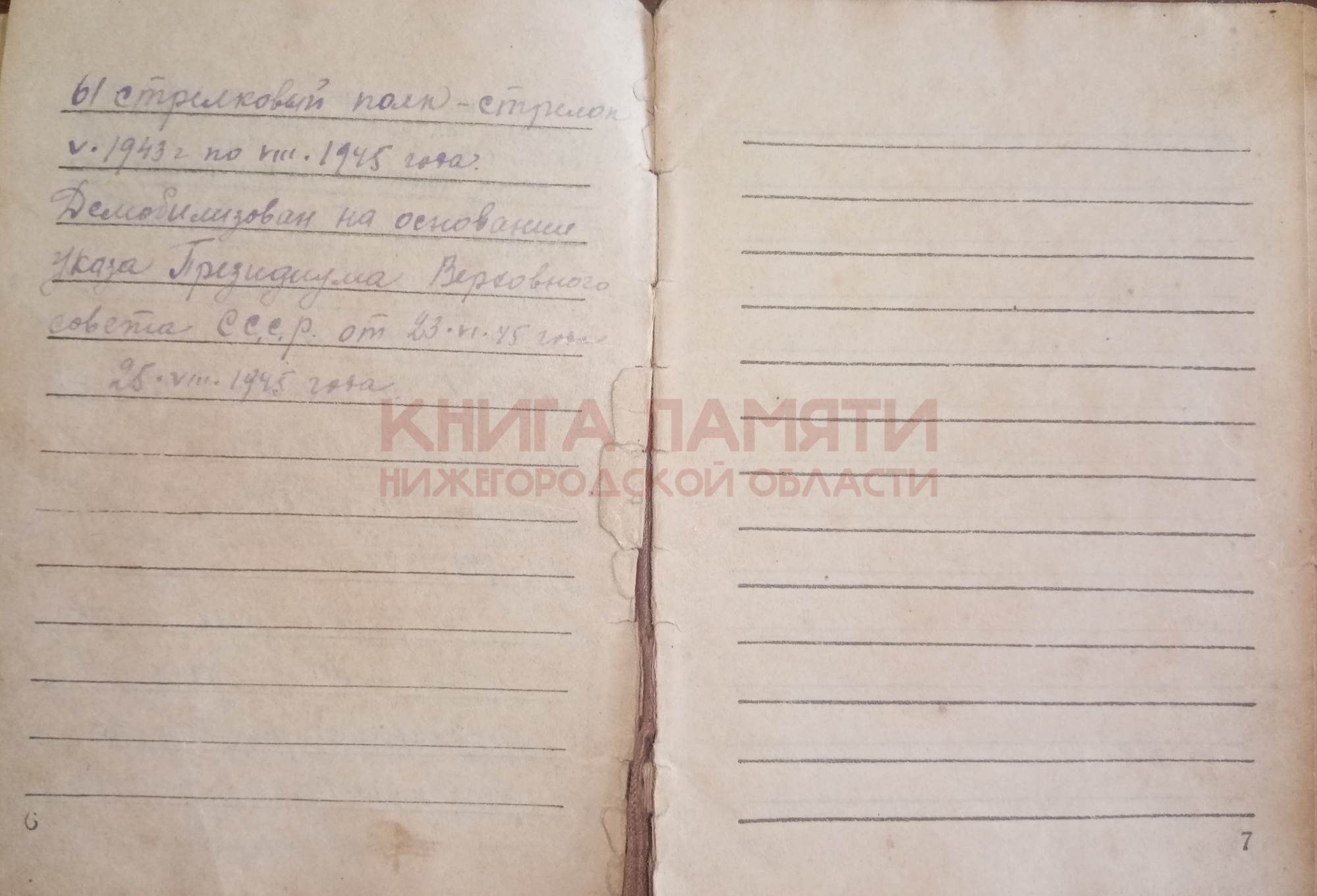 Воевал не Карельском фронте сначала в пе оте, а затем артиллеристом. Номер в расчете был "замковый" (закрывал пушку 122 мм). На подводе ездил за продуктами и снарядами. Когда пое ал за дополнительными снарядами, то на обратном пути попал под обстрел. Напарник и его лошадь погибли. Он подцепил его подводу к своей и пое ал дальше отвозить снаряды. Когда он почти дое ал его накрыло бомбёжкой второй раз. Был ранен в ногу и, пока лежал на земле, рядом взорвался еще один снаряд и контузил его. Потом был ранен еще 2 раза. Войну закончил в Норвегии.
