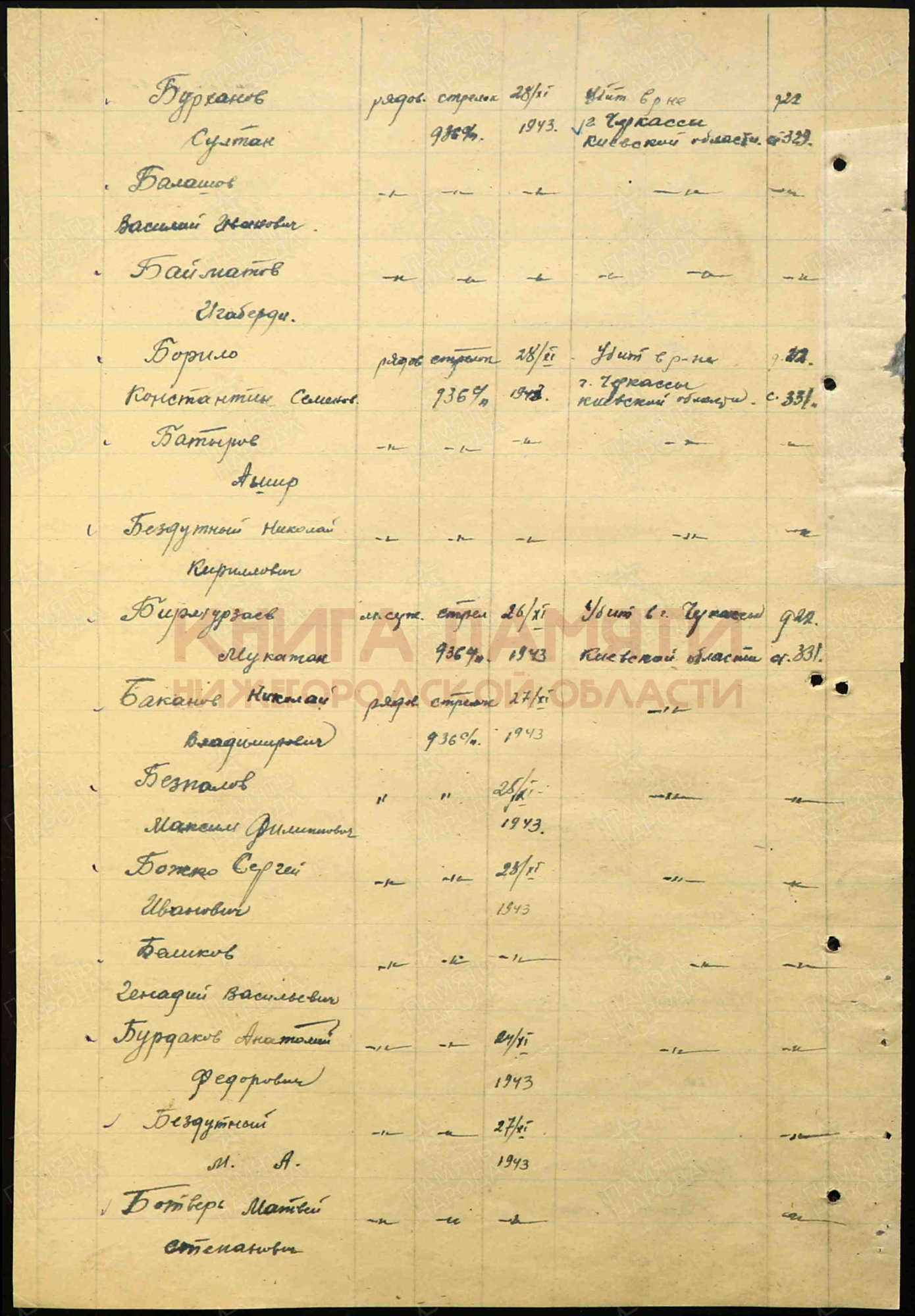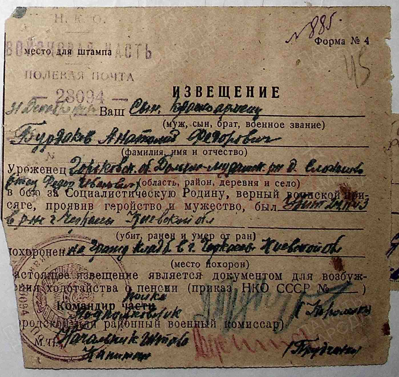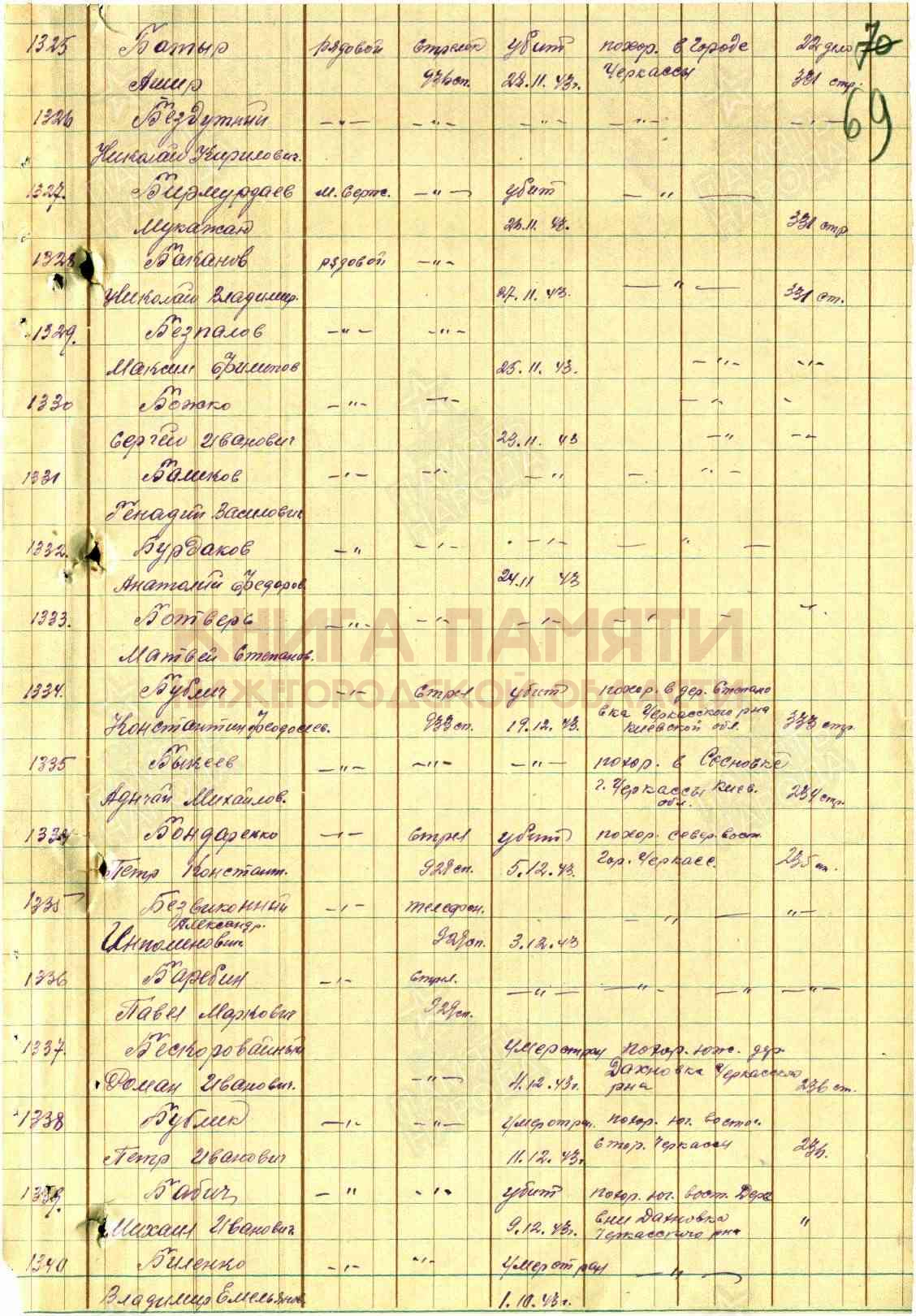 Погиб в бою 24.11.1943 Похоронен в г. Черкассы,Украина.