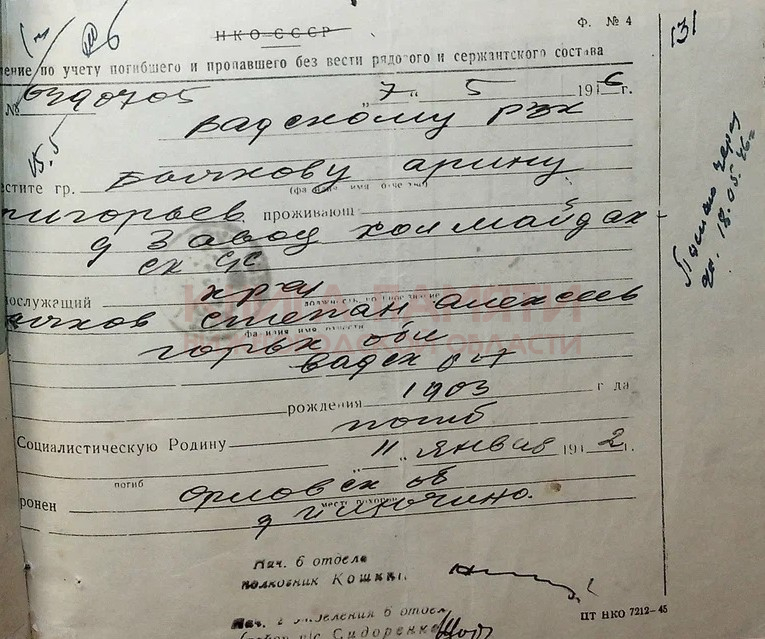 Похоронен в Орловской обл., д. Шенгино; Орловская обл., Жиздринский р-н, д. Илюшино ; Орловская обл. ; Орловская обл., д. Илючино