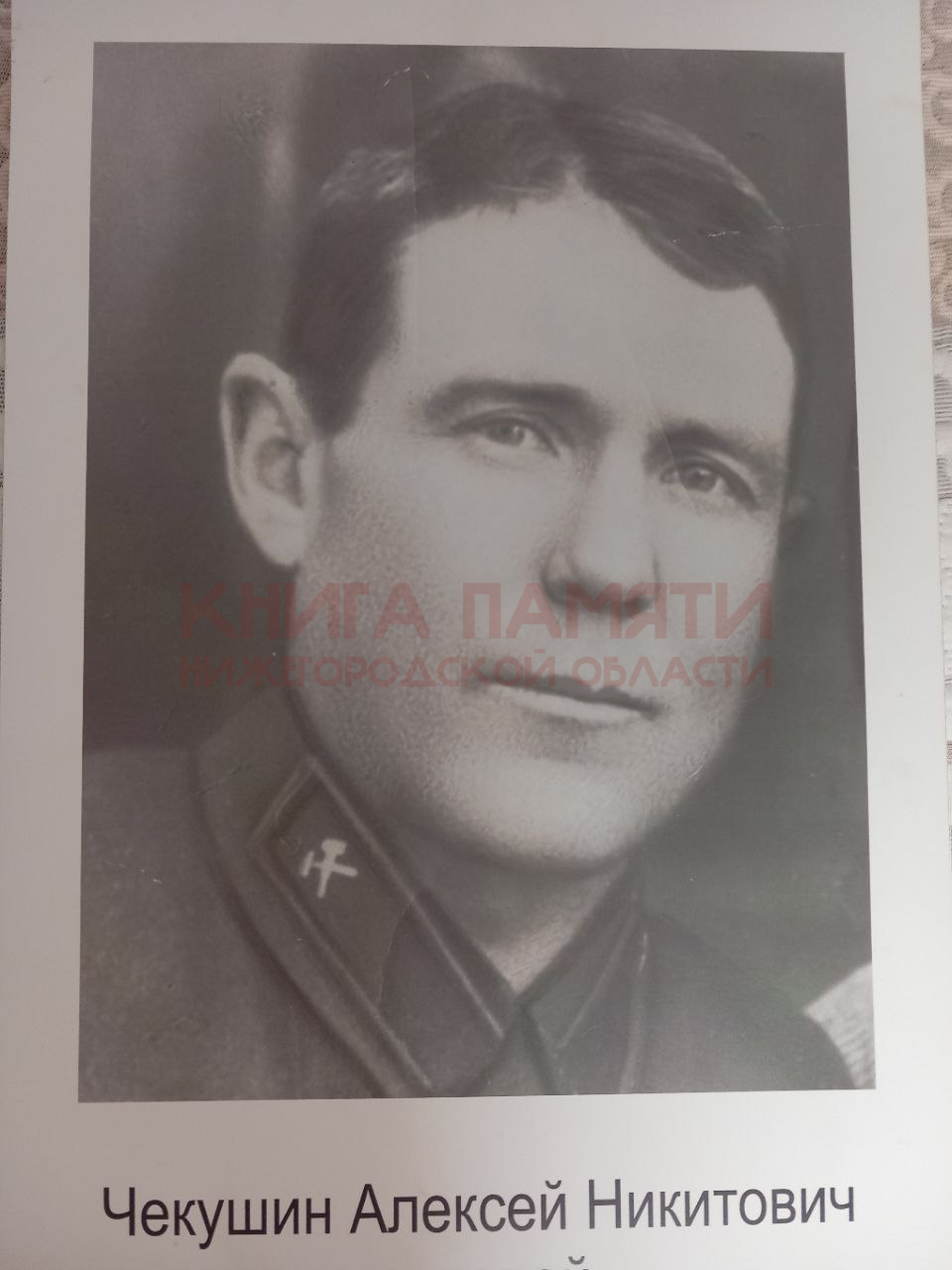 Чекушин Алексей Никитович родился в Горьковская обл., Борского р-н, д. Шерстнево. Проживал до начала ВОВ с семьей. Работал на железной дороге проводником. Алексей Никитович на фронте работал поваром. Жили в землянках. Умер 20.07.1943 года в возрасте 39 лет от тубекулеза легких. Похоронен в Архангелской области г. Архангельск на Первомайском военном кладбище, могила 181, умер в ЭГ-3433. После смерти осталось 8 детей.