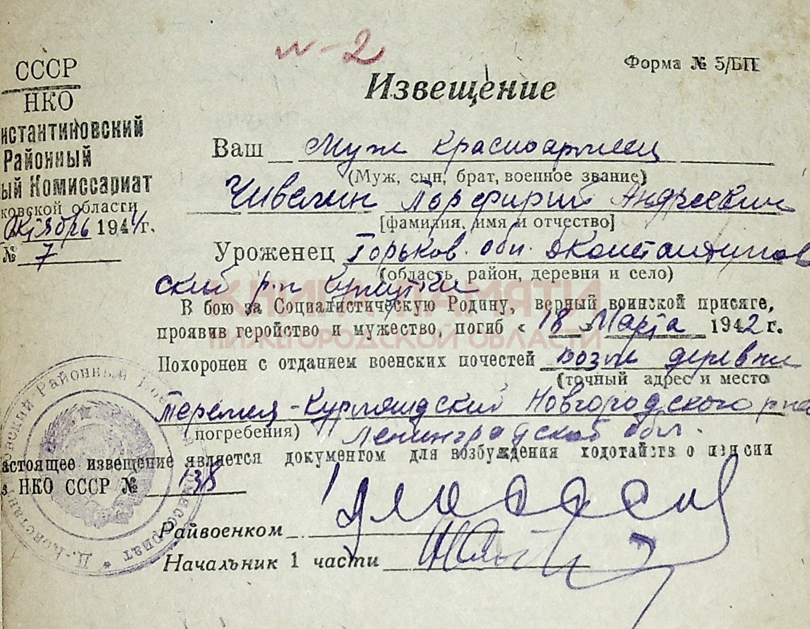 До призыва на фронт проживал в д.Кужутки, работал бригадиром дорожного строительства. Был мобилизован Дальнеконстантиновским РВК на фронт. Погиб 18 марта 1942г. Похоронен в Новгородском р-не Лениградской обл. Жена Чивалина Елена Николаевна.