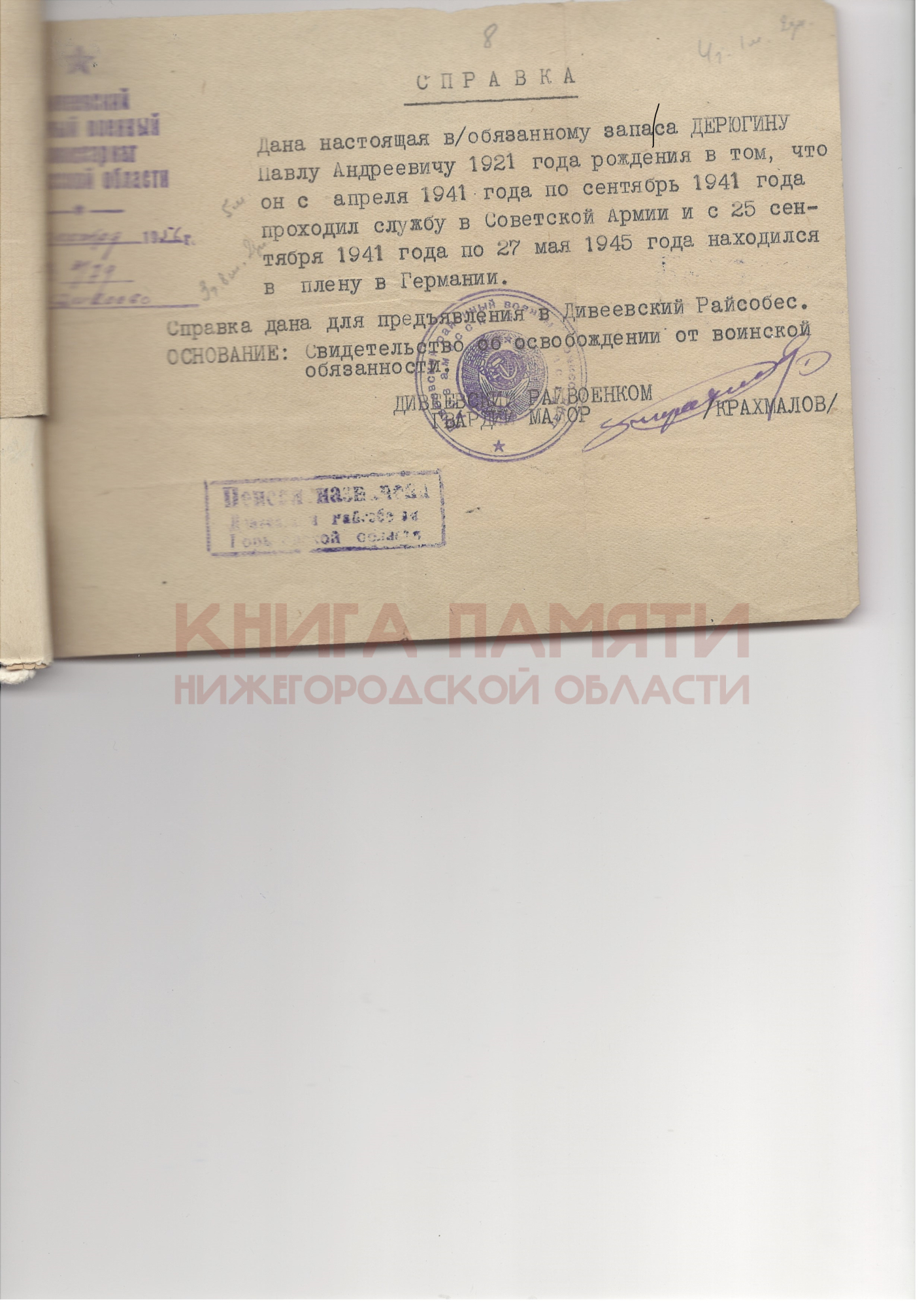С 25.09.1941 по 27.05.1945 находился в плену в Германии. Проживал в д.Рузаново Дивеевского района. Умер 11.04.1993г.