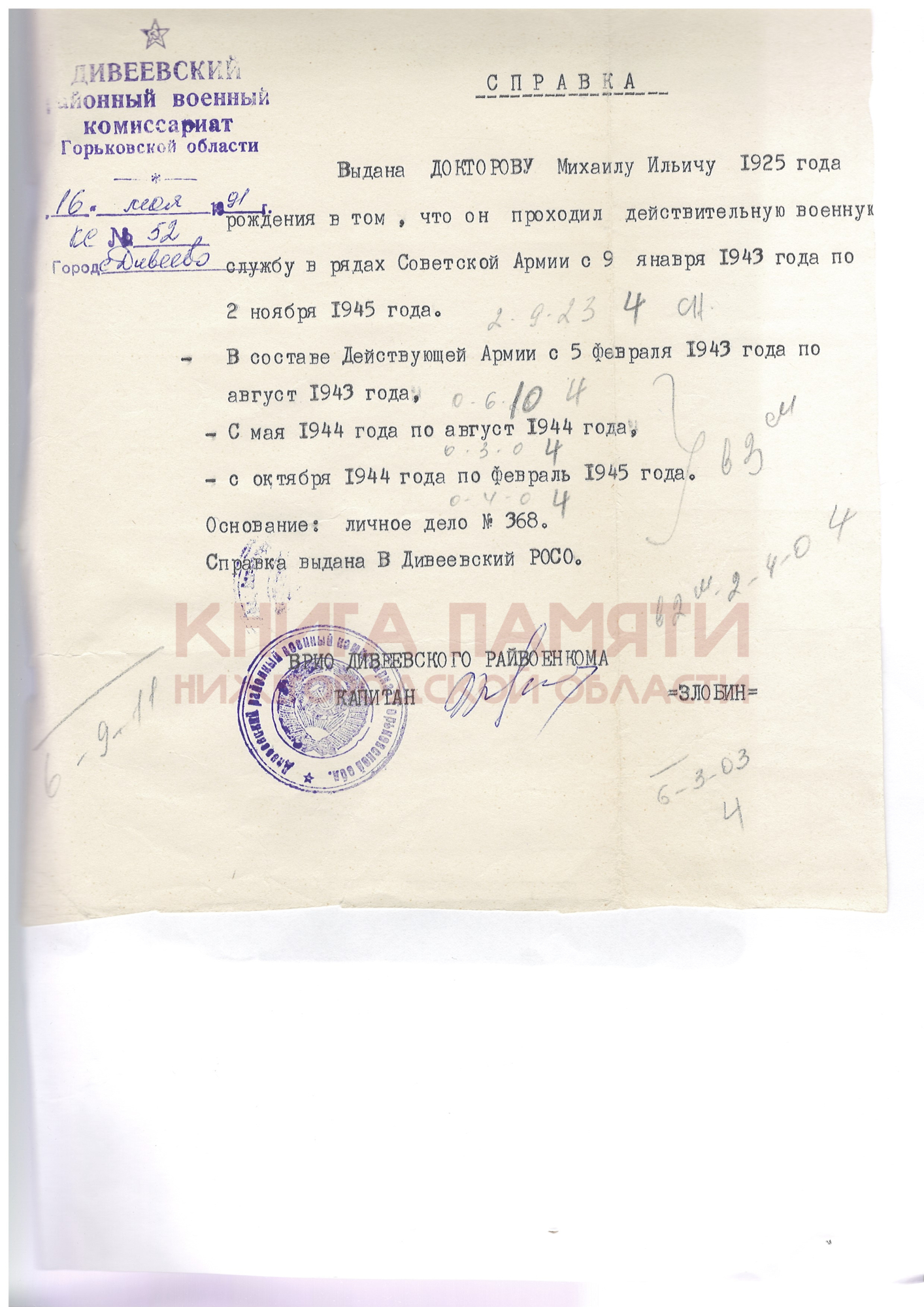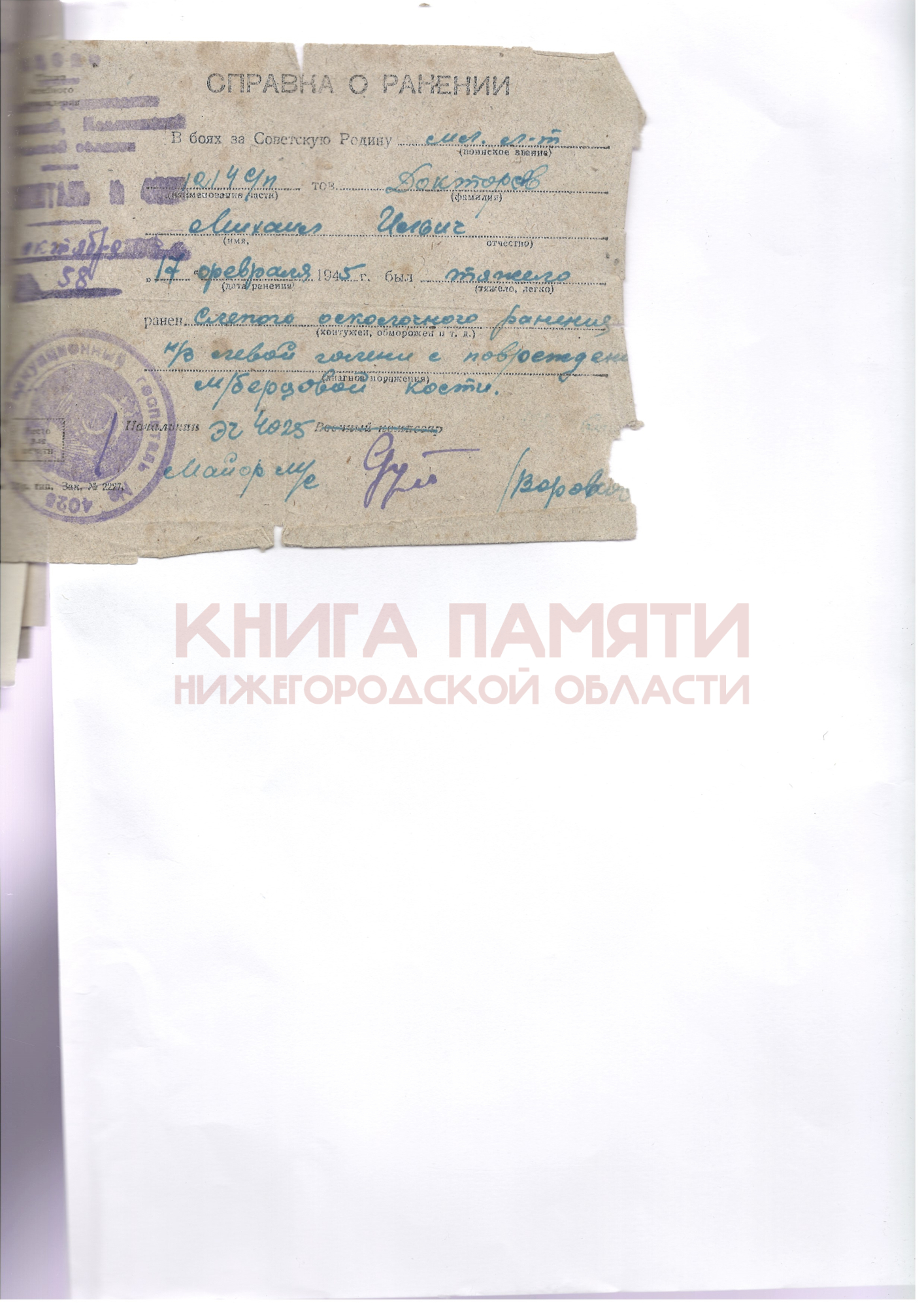 17.02.1945г. Был тяжело ранен в левую голень с повреждением м/берцовой кости. Демобилизован 02.11.1945г. Умер 28.08.1994г.