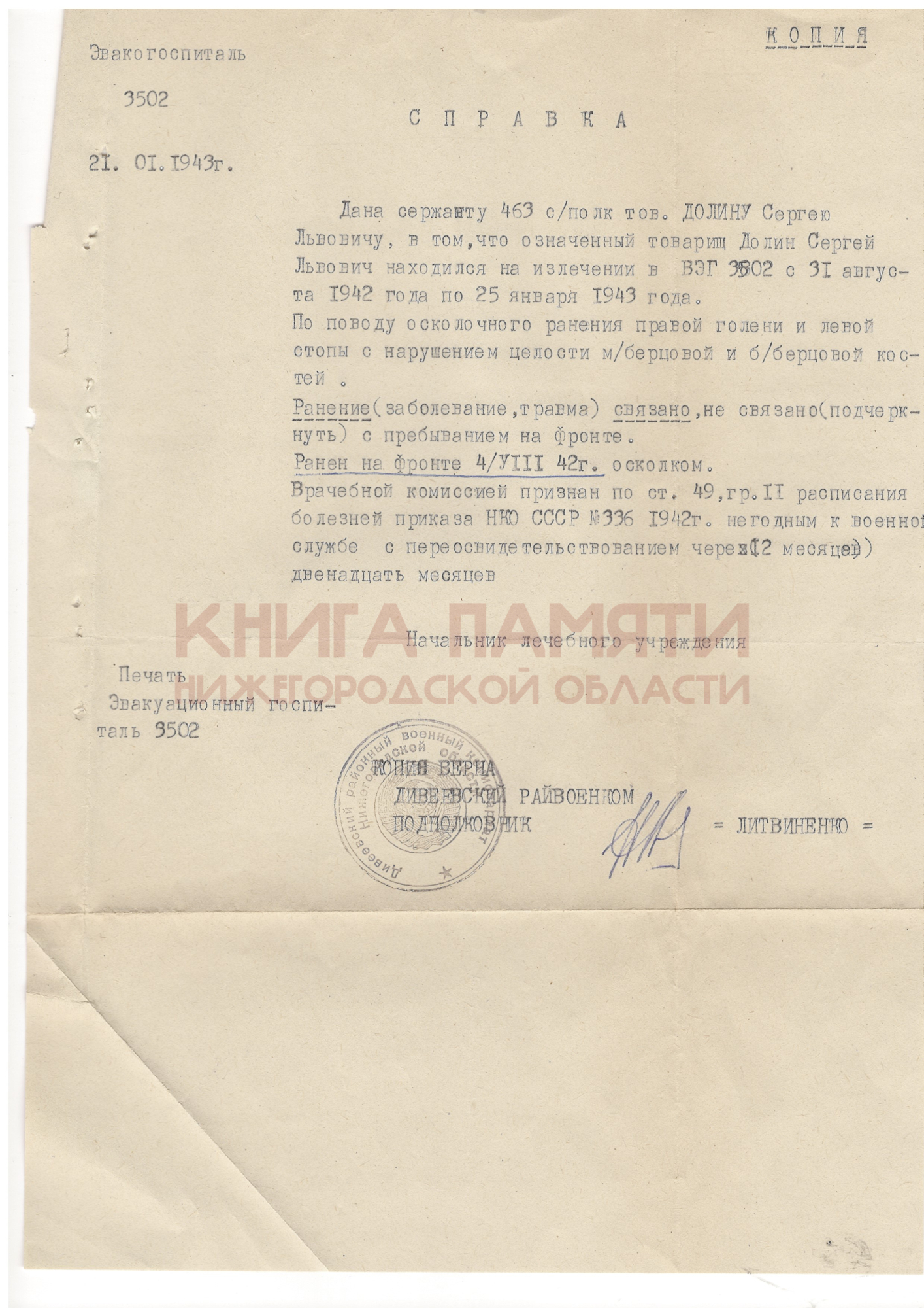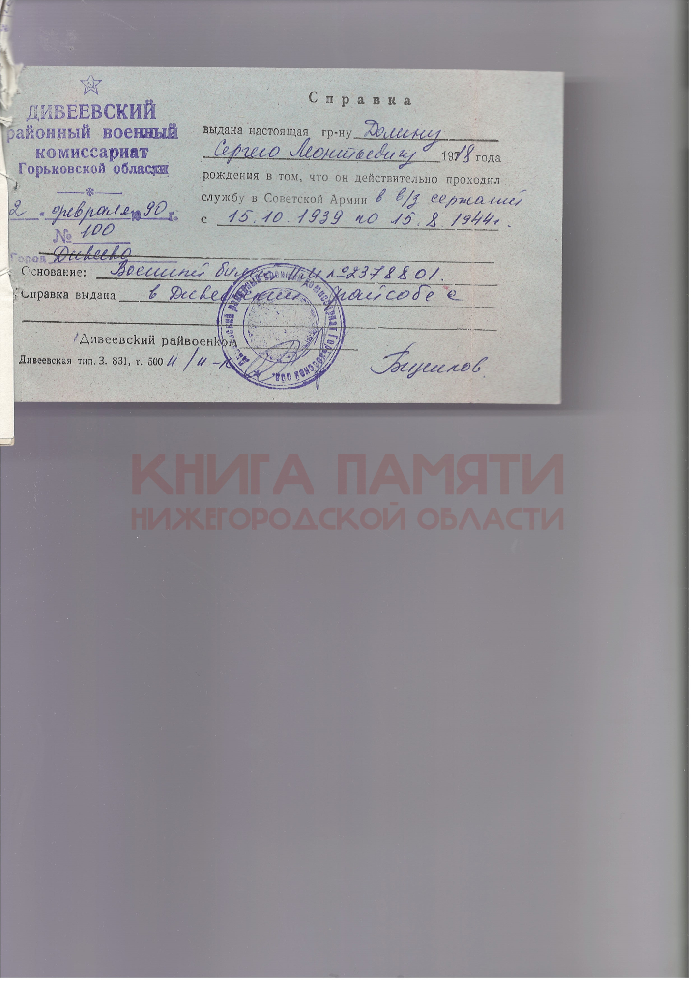 Инвалид ВОВ 3 группы. Находился на излечении в ЭГ3802 с 31.08.1942г. по 25.01.1943г. Демобилизован 15.08.1945г.Проживал в с. Кременки Дивеевского района. Умер 03.11.1994