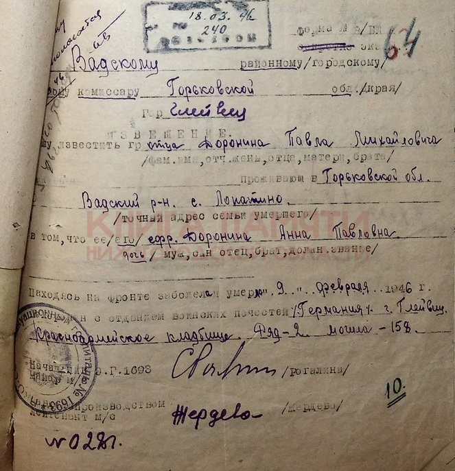 Место захоронения Польша, г. Глейвиц (он же Гливице), красноармейское кладбище, ряд 2, могила № 158 ; в г. Глей- вице, Германия