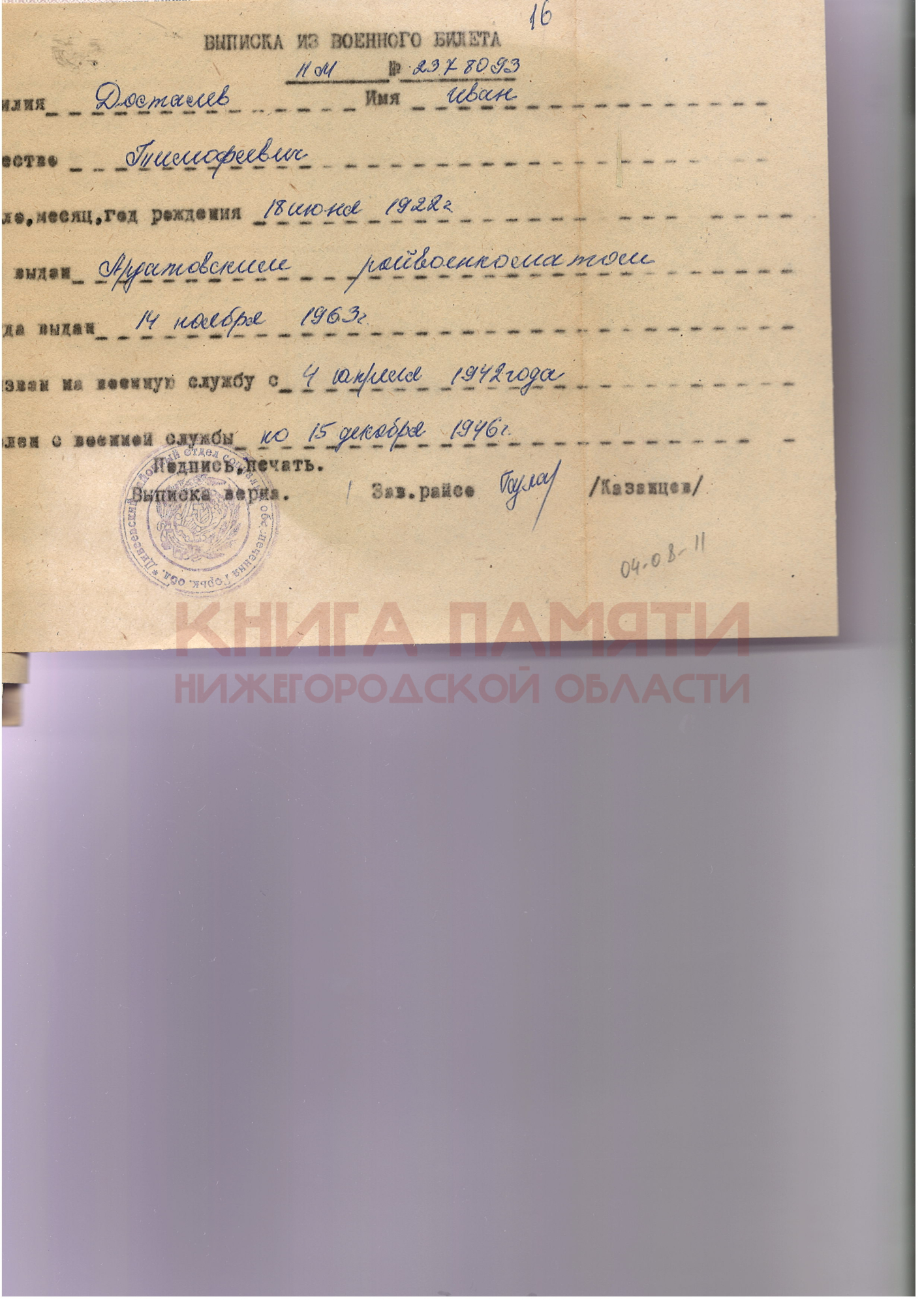 Демобилизован 15.12.1946г. Проживал в п.Сатис Дивеевского р-на. Умер 20.03.1995