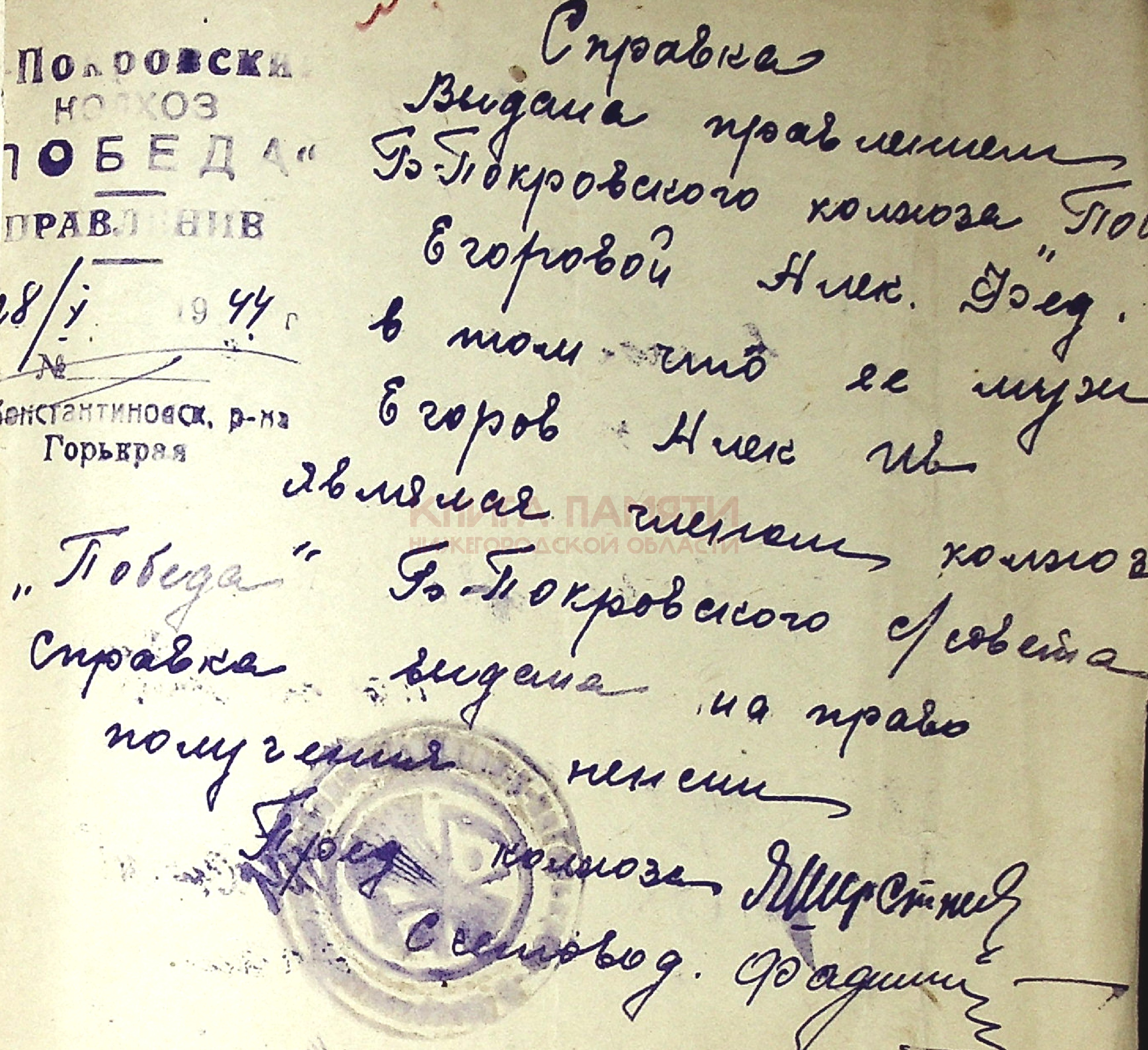 Уроженец с. Б-Покровское Д-Константиновского района Горьковской области, до призыва на фронт работал в колхозе "Победа" Б-Покроского сельсовета. В июле 1941 года призван на фронт и направлен в Горвоенкомат. Пропал без вести в октябре 1941года. Жена -Егорова Александра Федоровна, дочь- Егорова Анна Александровна 1937г., дочь- Егорова Валентина Александровна 1941г.