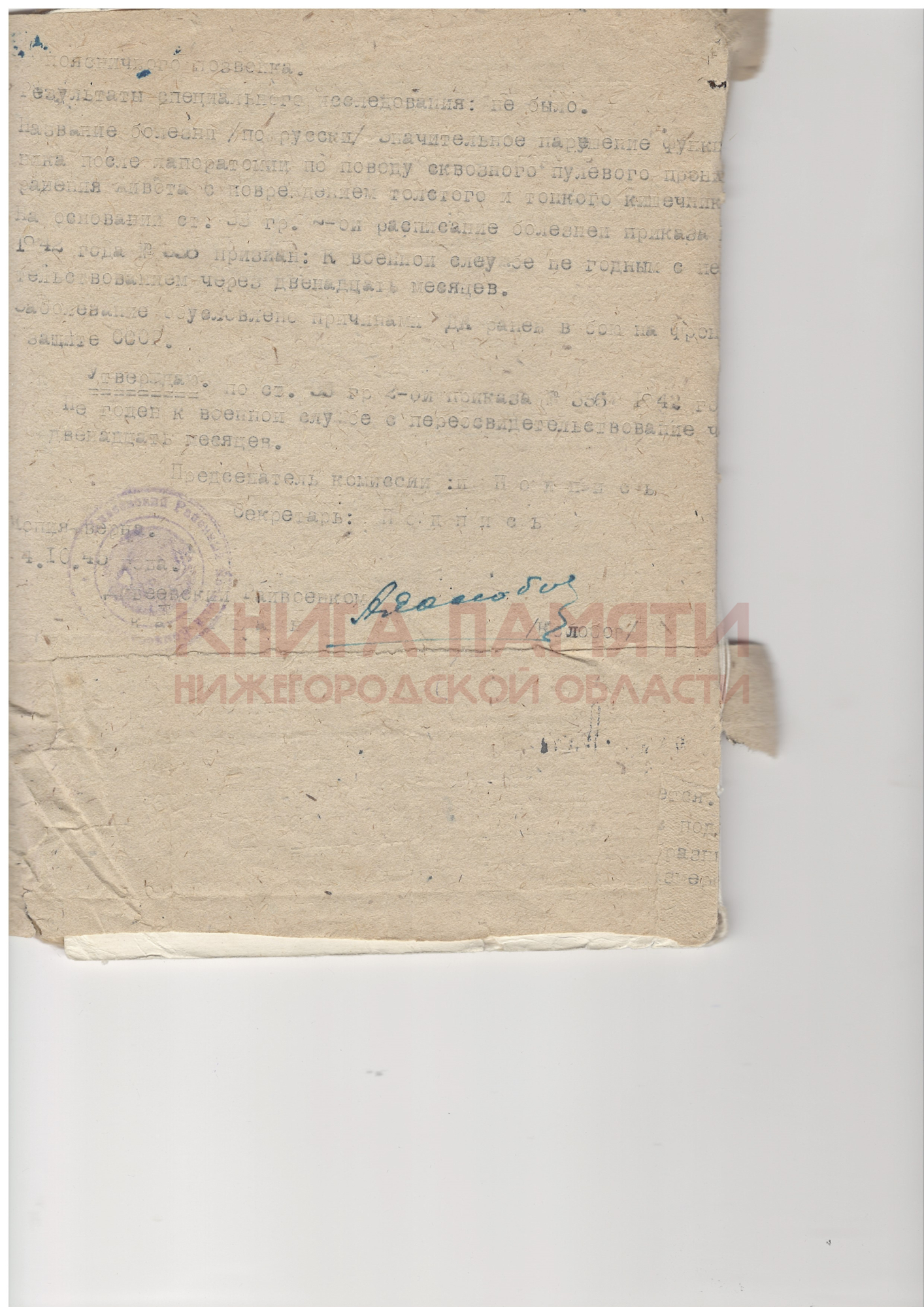 Инвалид ВОВ 2 группы. Принимал участие в освобождении Украины, Молдавии, Болгарии, Венгрии, Югославии.Был ранен 02.04.1945г. пулей в живот, находился на излечении в ЭГ 3238, Эг 3226, ЭГ 2562. 3 августа 1945 г. признана негодным к несению военной службы. Проживал в с.Б.Череватово Дивеевского района,работал в Б.Череватовском колхозе счетоводом-бухгалтером, с 1964 г. избран председателем Б.Череватовского колхоза. Умер 22.05.2001
