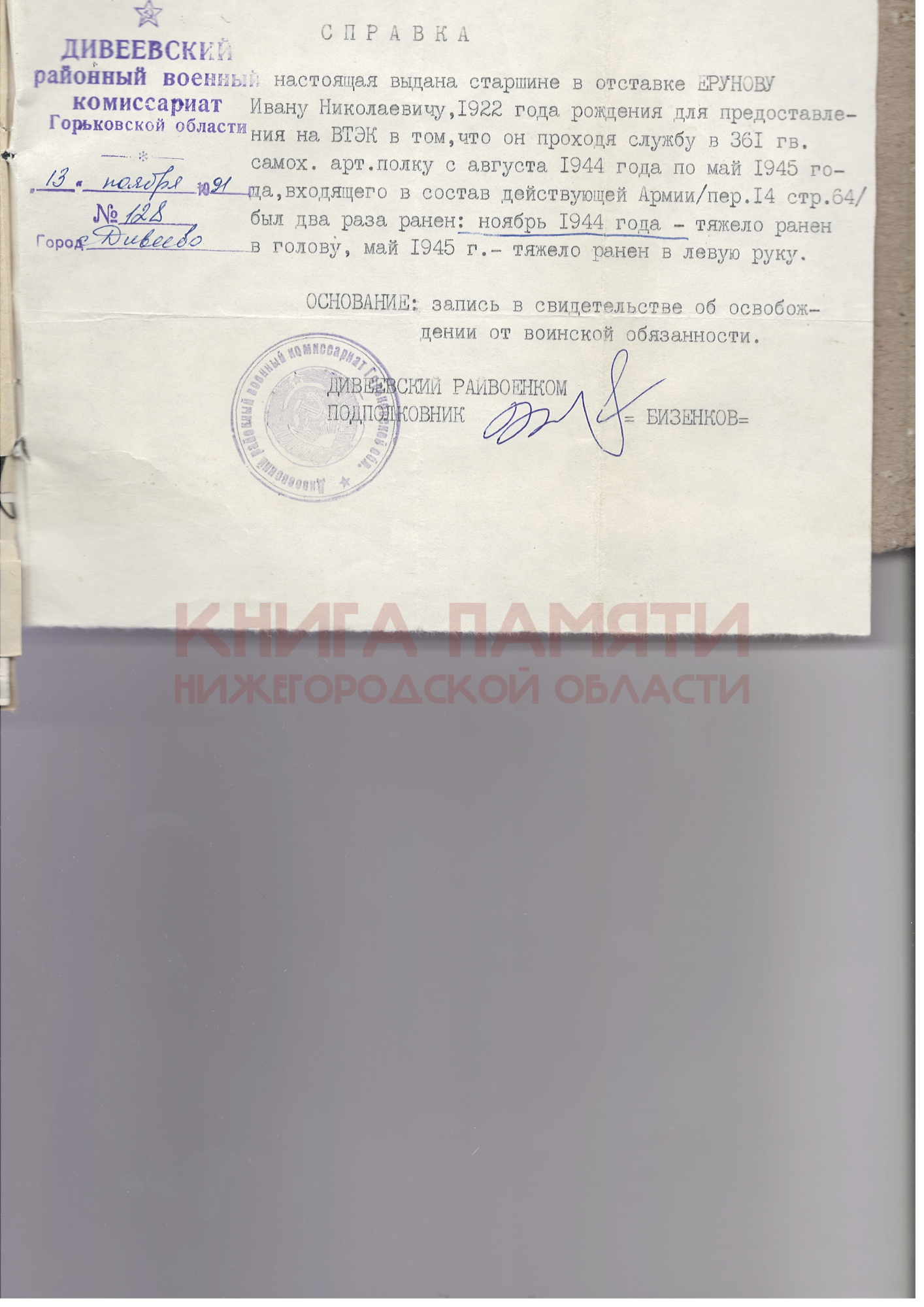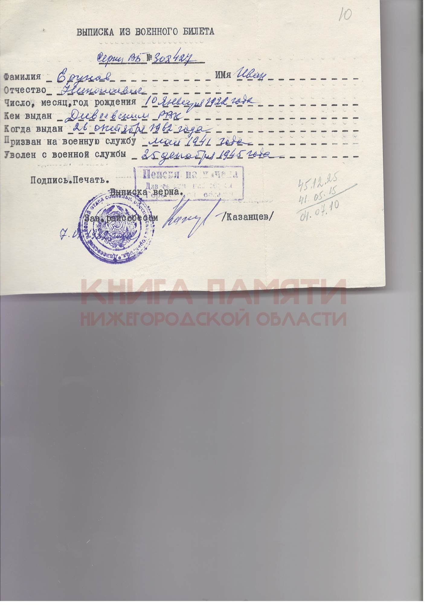 Инвалид ВОВ 1 группы. Демобилизован 25.12.1945 г. Два раза был ранен- в ноябре 1944 г. тяжелое ранение в голову, в мае 1945 г. тяжелое ранение в левую руку. Проживал в д. Осиновка Дивеевского района, с 1969 года до выхода на пенсию работал слесарем на Дивеевском хлебозаводе. Умер 20.09.1995