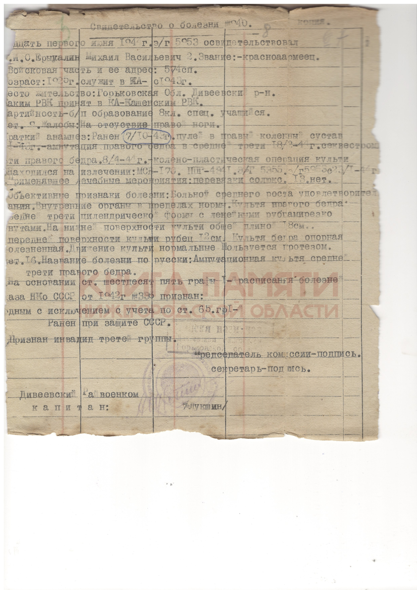 Инвалид ВОВ 3 группы. Был ранен 07.10.1943г., находился на излечении в МСВ 170, ППГ 4841, ЭГ 5355, ЭГ5953, ампутировано правое бедро. Демобилизован 21.06.1944г. Проживал в с.Конново Дивеевского района, работал в Конновской средней школе с 1951 года счетоводом, затем в 1964 году переведен лаборантом. Умер 14.10.1995