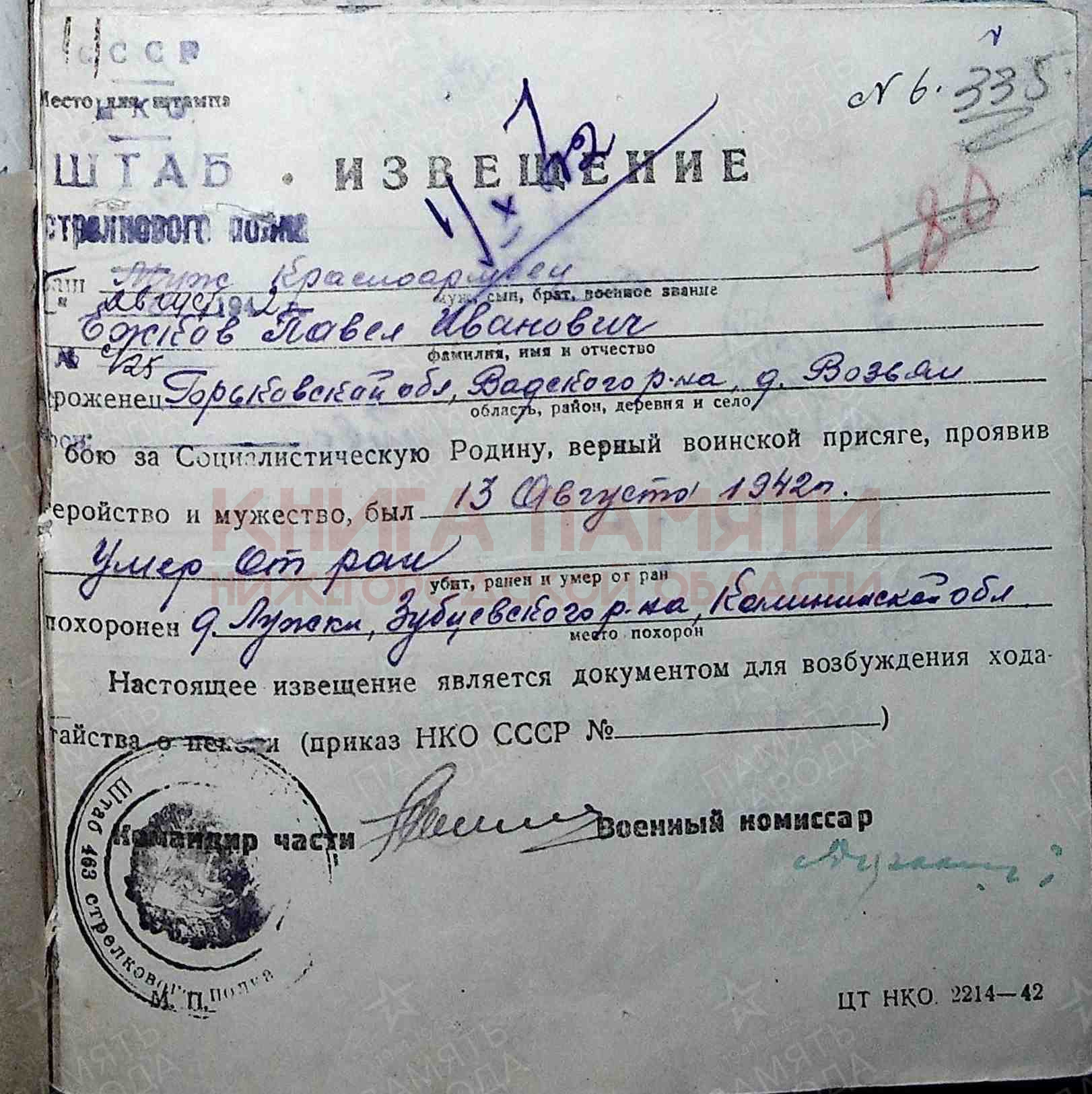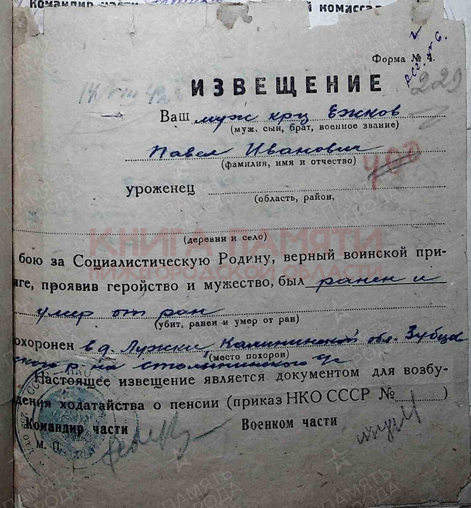 Место захоронения: Калининская обл., Зубцовский р-н, Столыпинский с/с, д. Лужки; г. Зубцов, ул. Московская Гора; Тверская обл., Зубцовский р-н, д. Лужки, Московская Гора