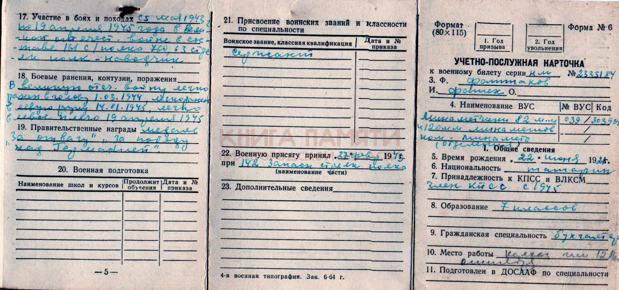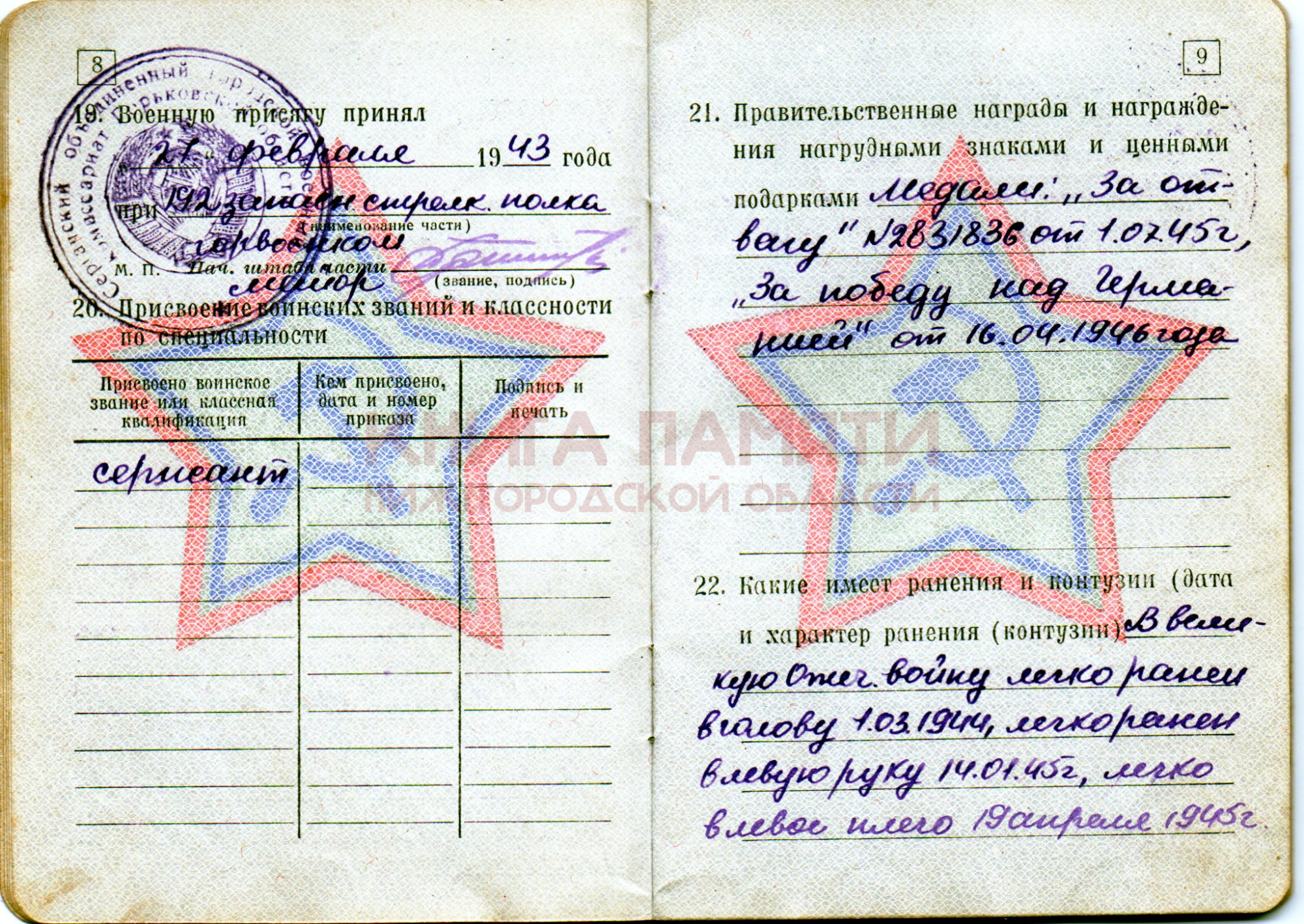 Был легко ранен в голову 01.03.1943, легко ранен в левую руку 14.01.1945, легко ранен в левое плечо 19.01.1945