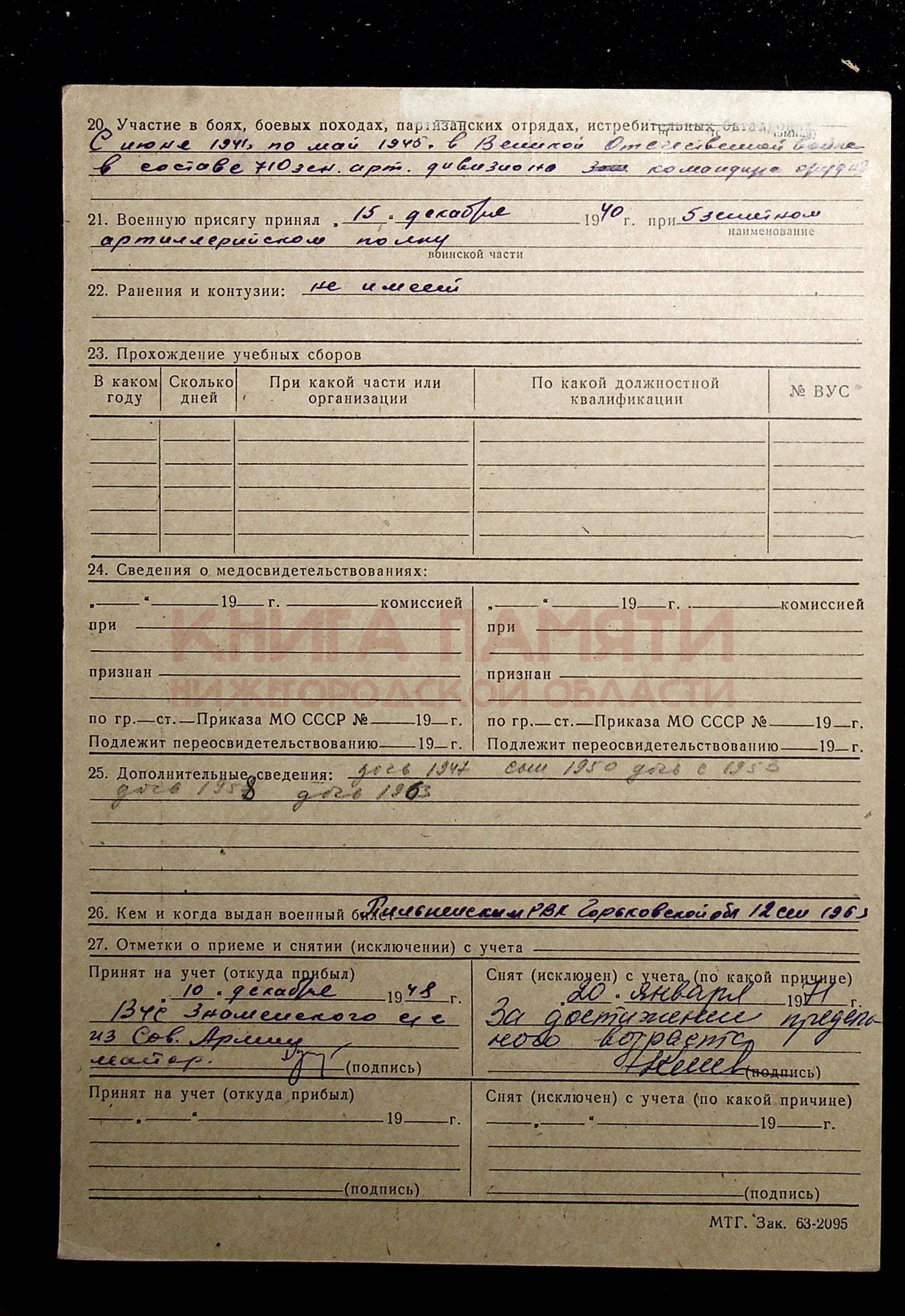 Участвовал в Великой Отечественной войне с июня 1941г по май 1945г в составе 710 зенит. арт.дивизиона -командир орудия.
