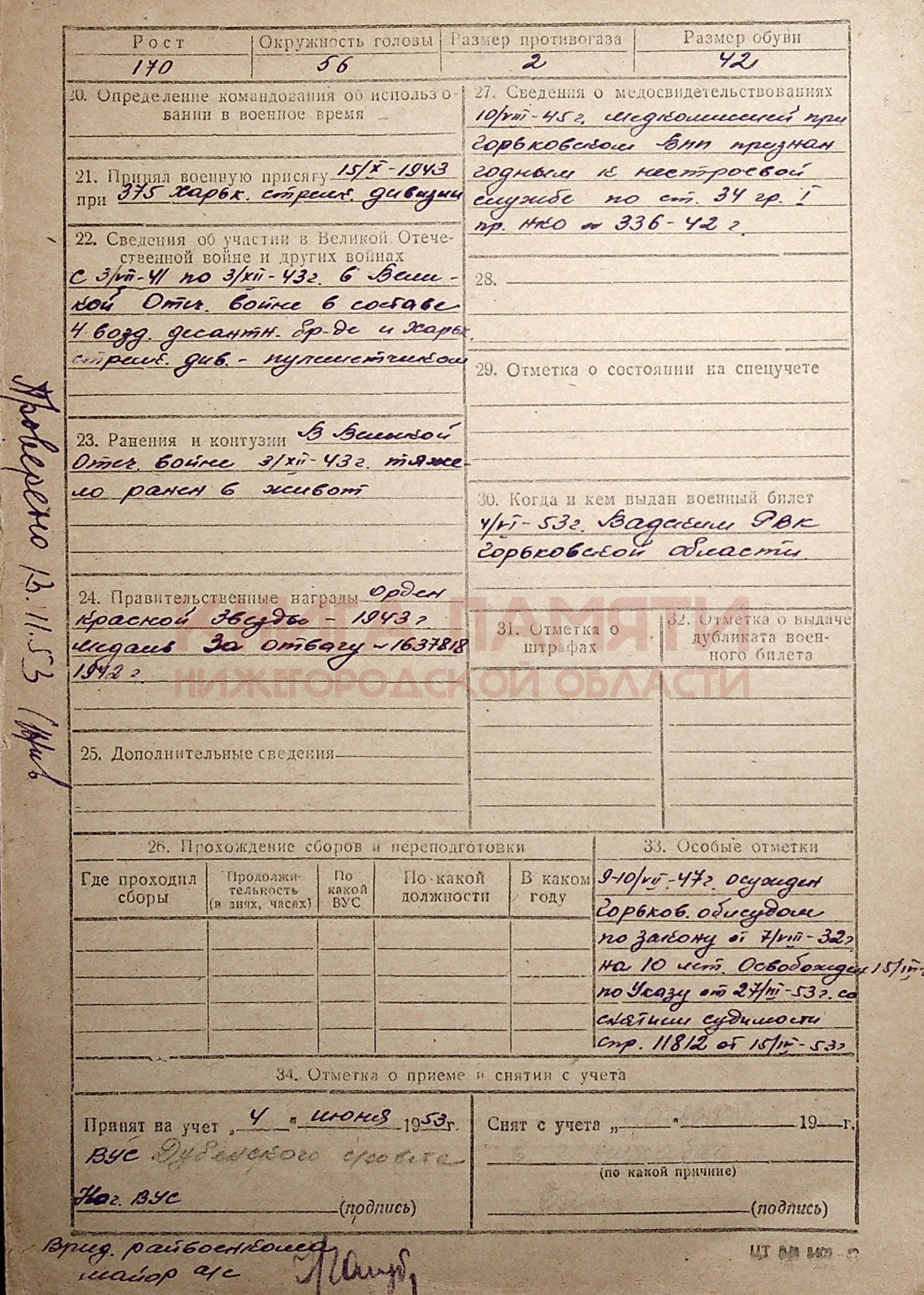 Уволен по ранению в 1944, демобилизован на основании Указа Президиму Верховного Совета СССР от 25.09.1945