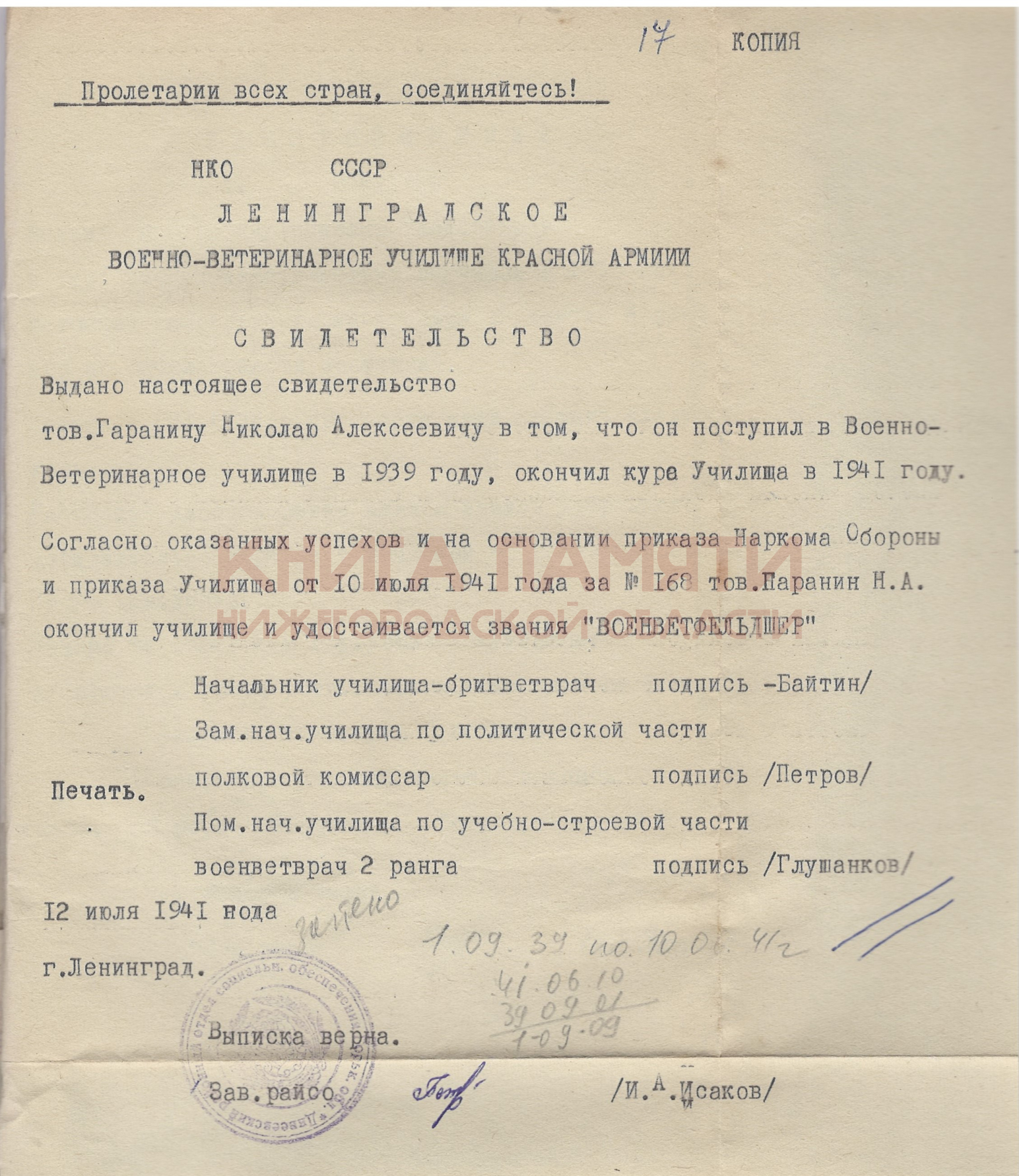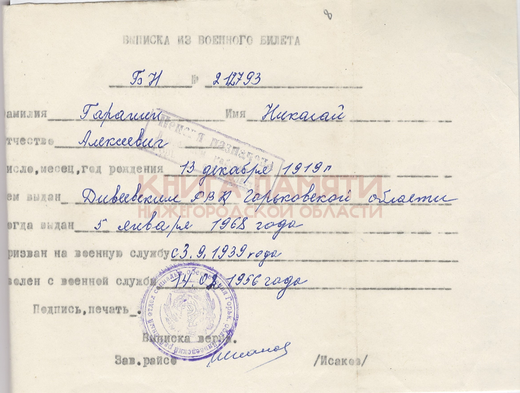 Закончил Ветошкинскимсельскохозяйственный техникум Наркозем СССР по специальности зоотехния в 1939г. Демобилизован 14.02.1956г. Проживал в с.Суворово Дивеевского района. Работал ветфельдшером в колхозе "Суворовский".Умер 27.10.1984
