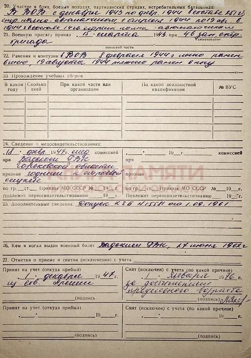 В 1944 г. получил два ранения. Уволен в запас в 1946 г.