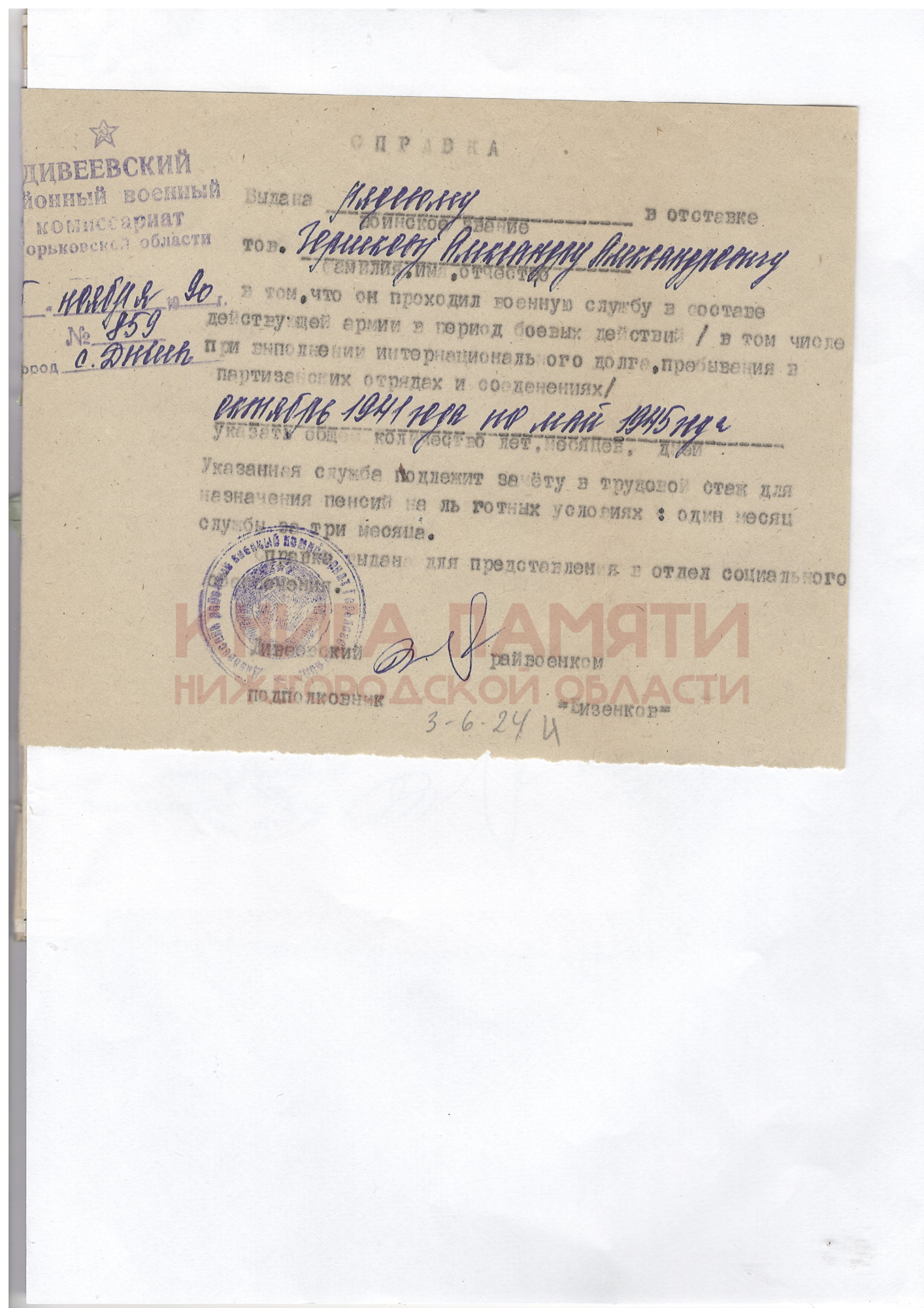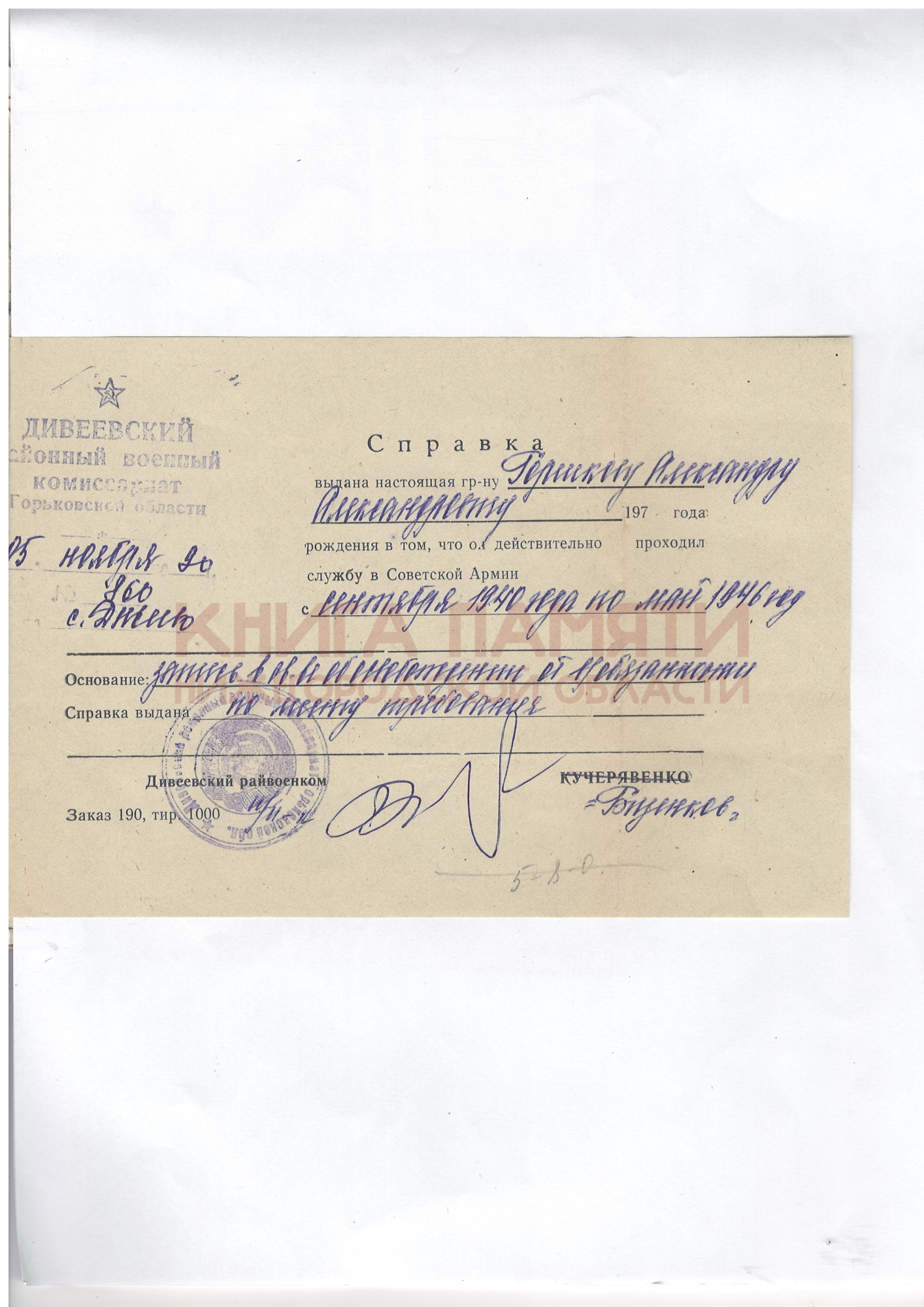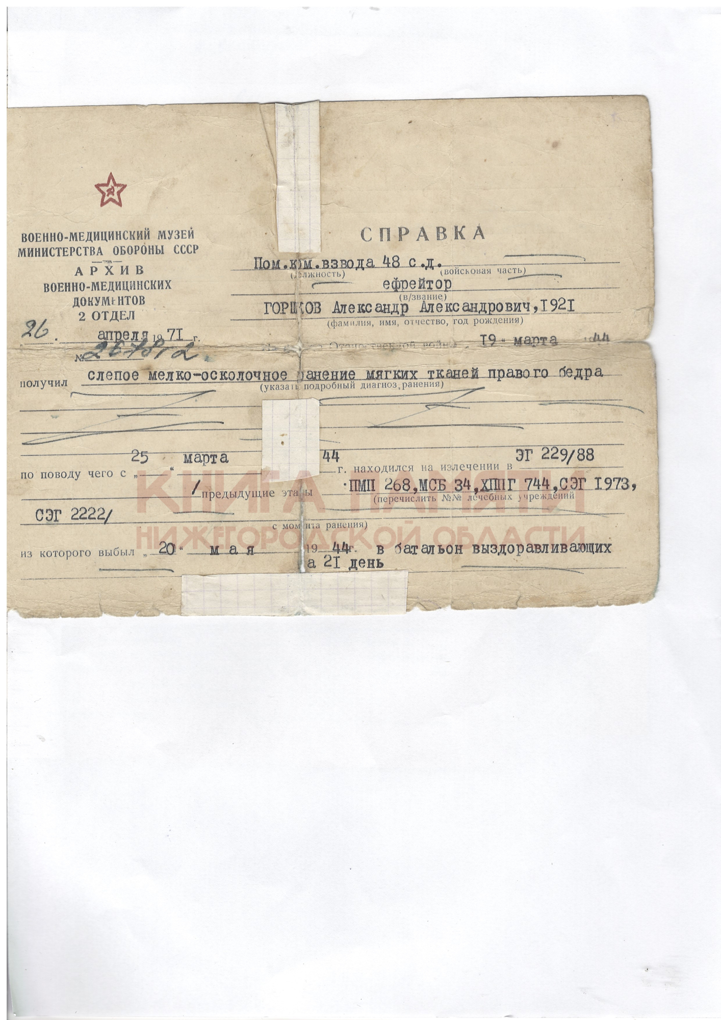 Был ранен на фронте,проходил излечение в ЭГ 229/88 с 25.03.1944г. по 20.05.1944г. Проживал в с.Верякуши Дивеевского района. Умер 01.07.1991
