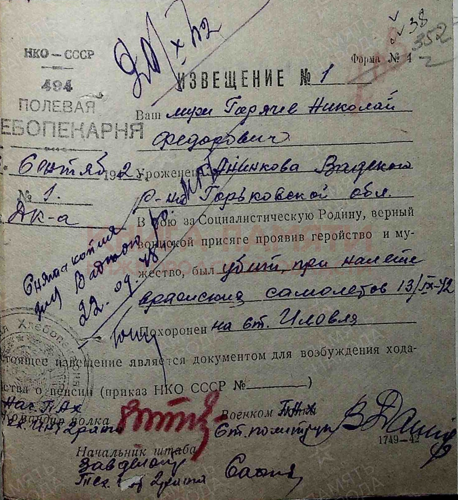Погиб в бою 13 сентября 1942 г.