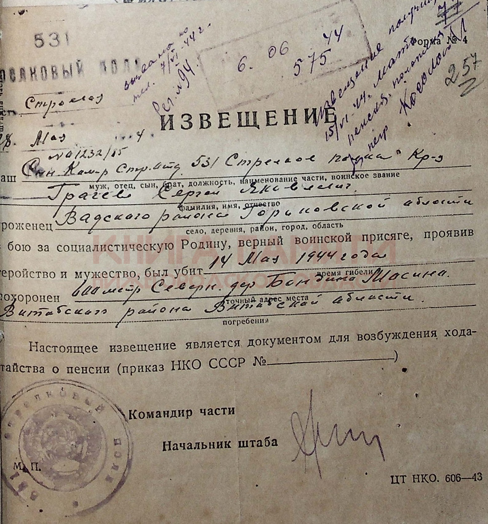 Погиб в бою 14 мая 1944 г. Место захоронения - Белорусская ССР, Витебская обл., Витебский р-н, Бондино-Мосино, севернее, 600 м