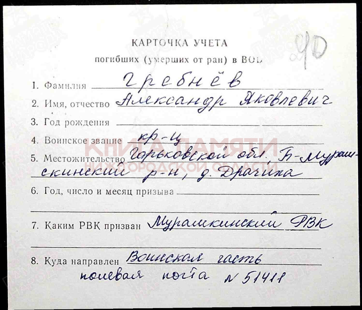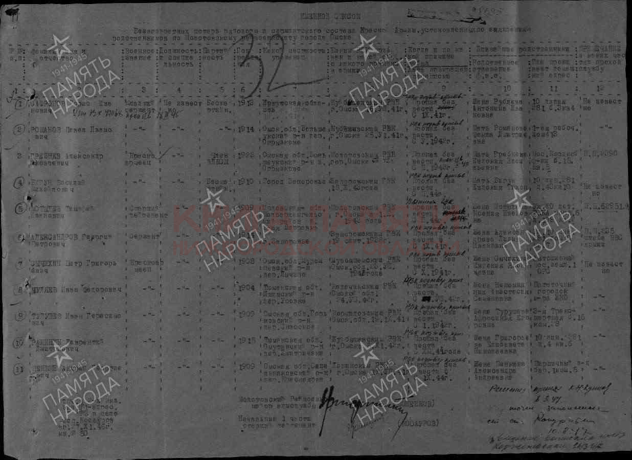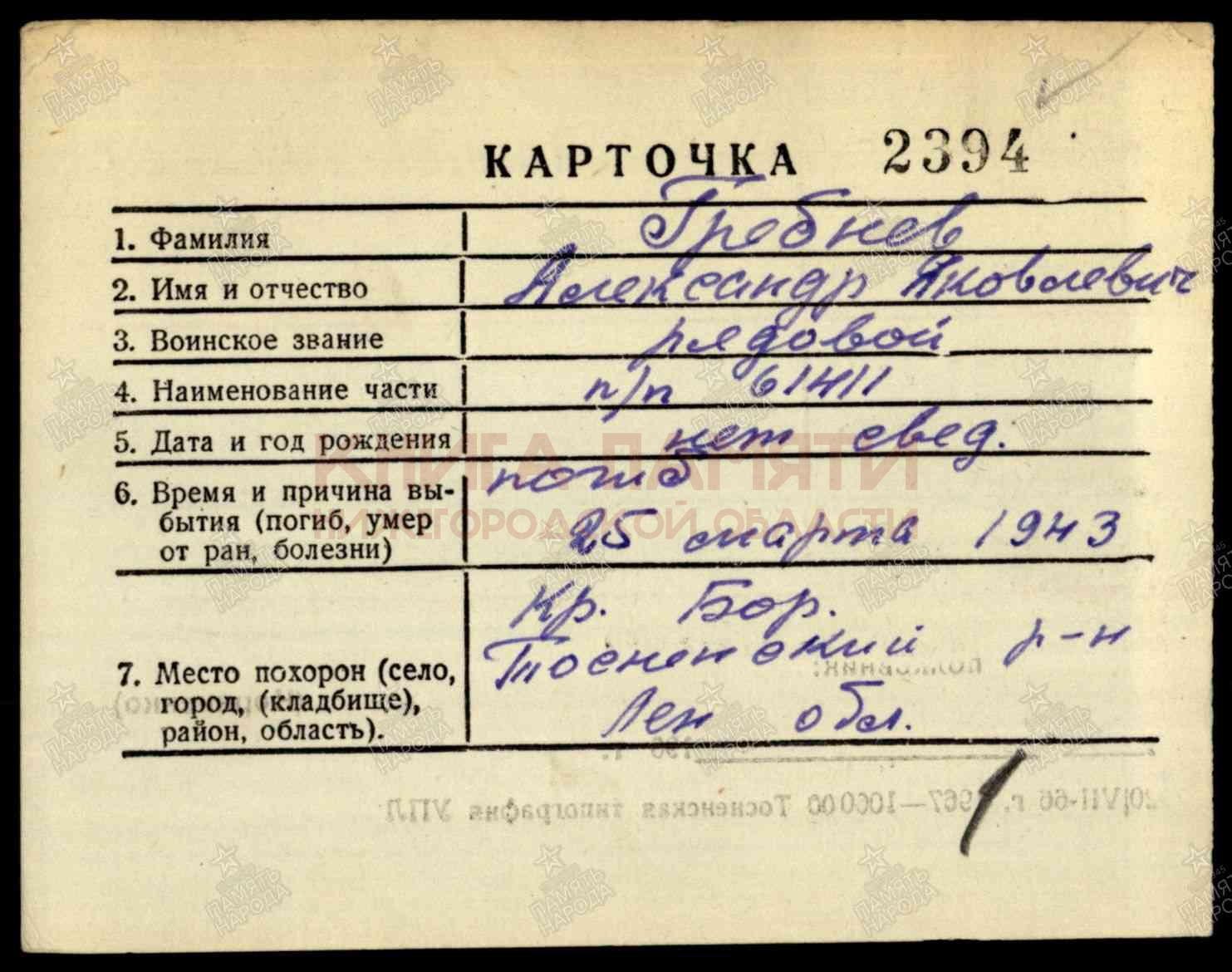 Тосненский р-н, п. Кр. Бор, пр. К. Маркса ; Ленинградская обл., Погиб в бою 25.03.1943.