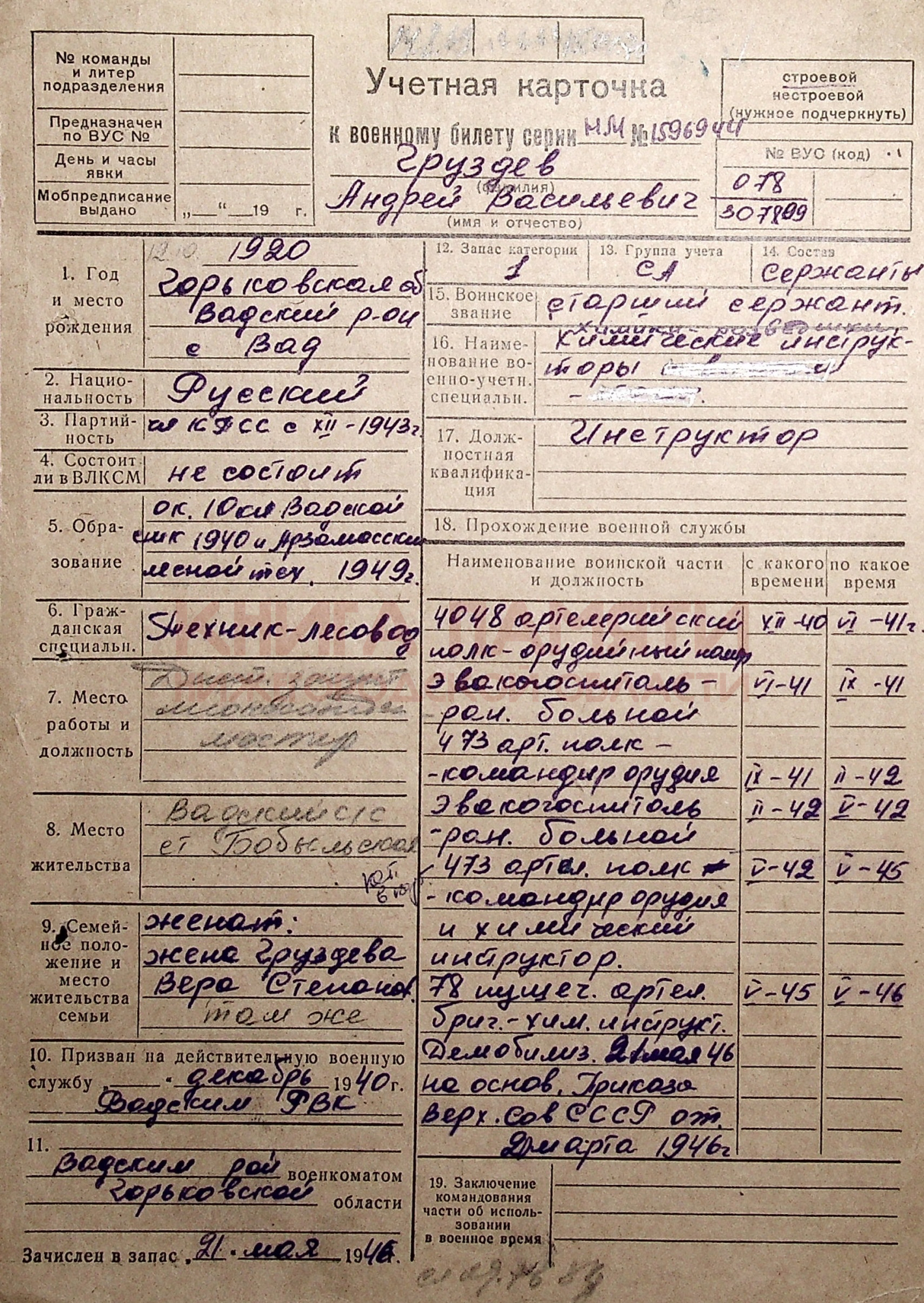Таким запомнил первый день войны Андрей Васильевич Груздев. Вместе со своей частью он отступал на Восток. Постоянно приходилось участвовать в боях. На десятый день войны Андрей Васильевич был ранен.
