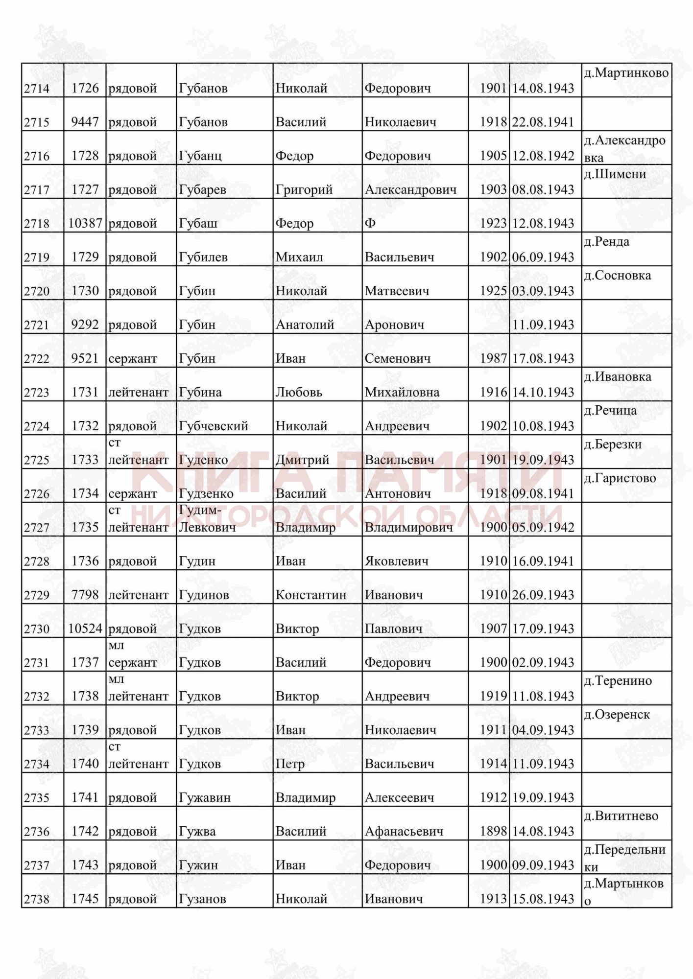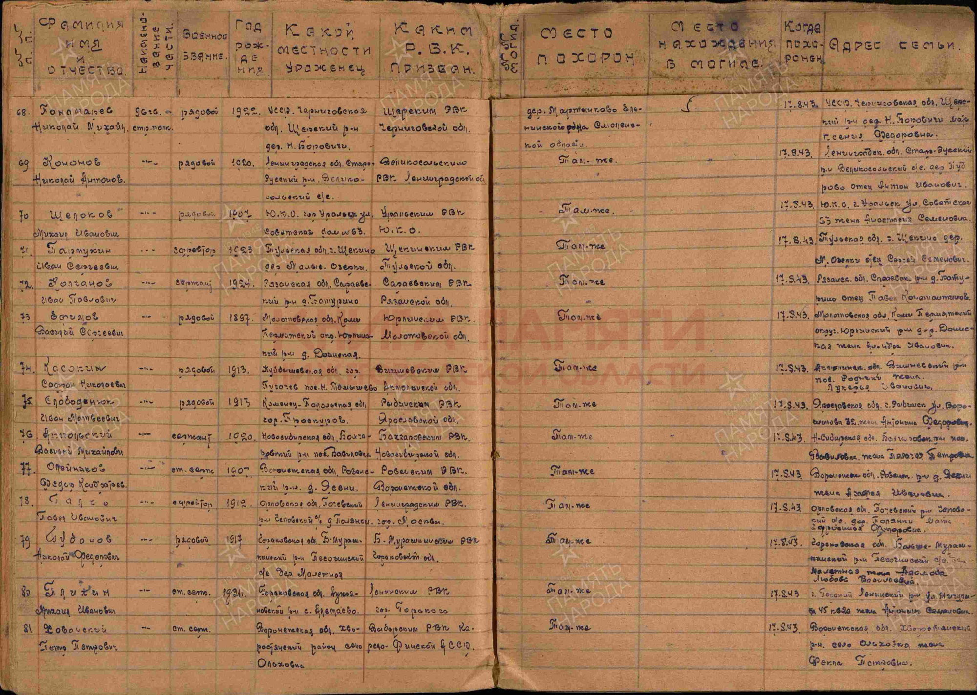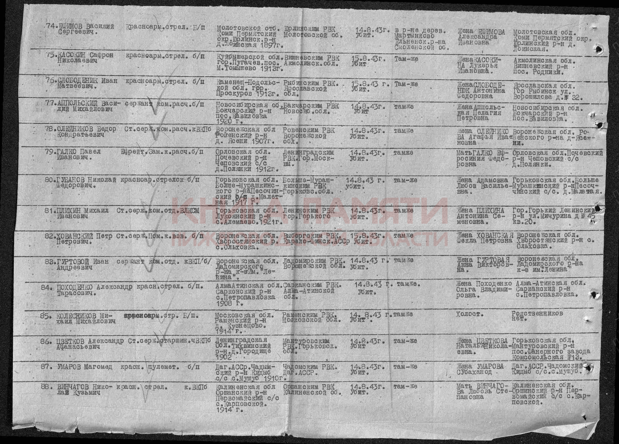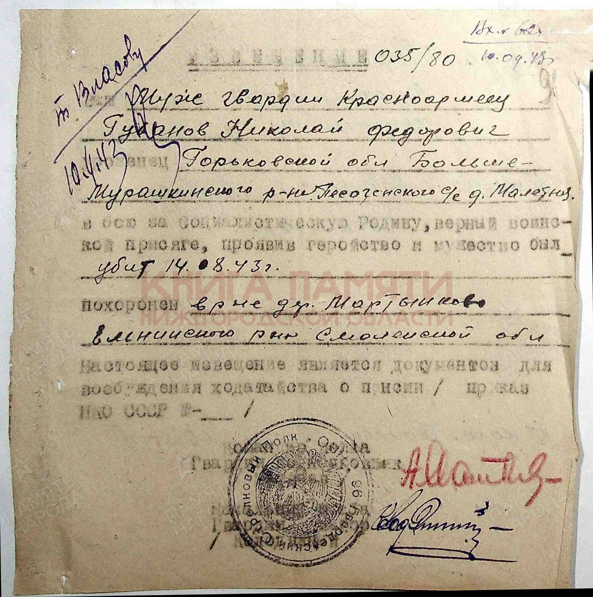 Погиб в бою 14.08.1943. Похоронен в Смоленская обл., Ельнинский р-н, д.Мартинково