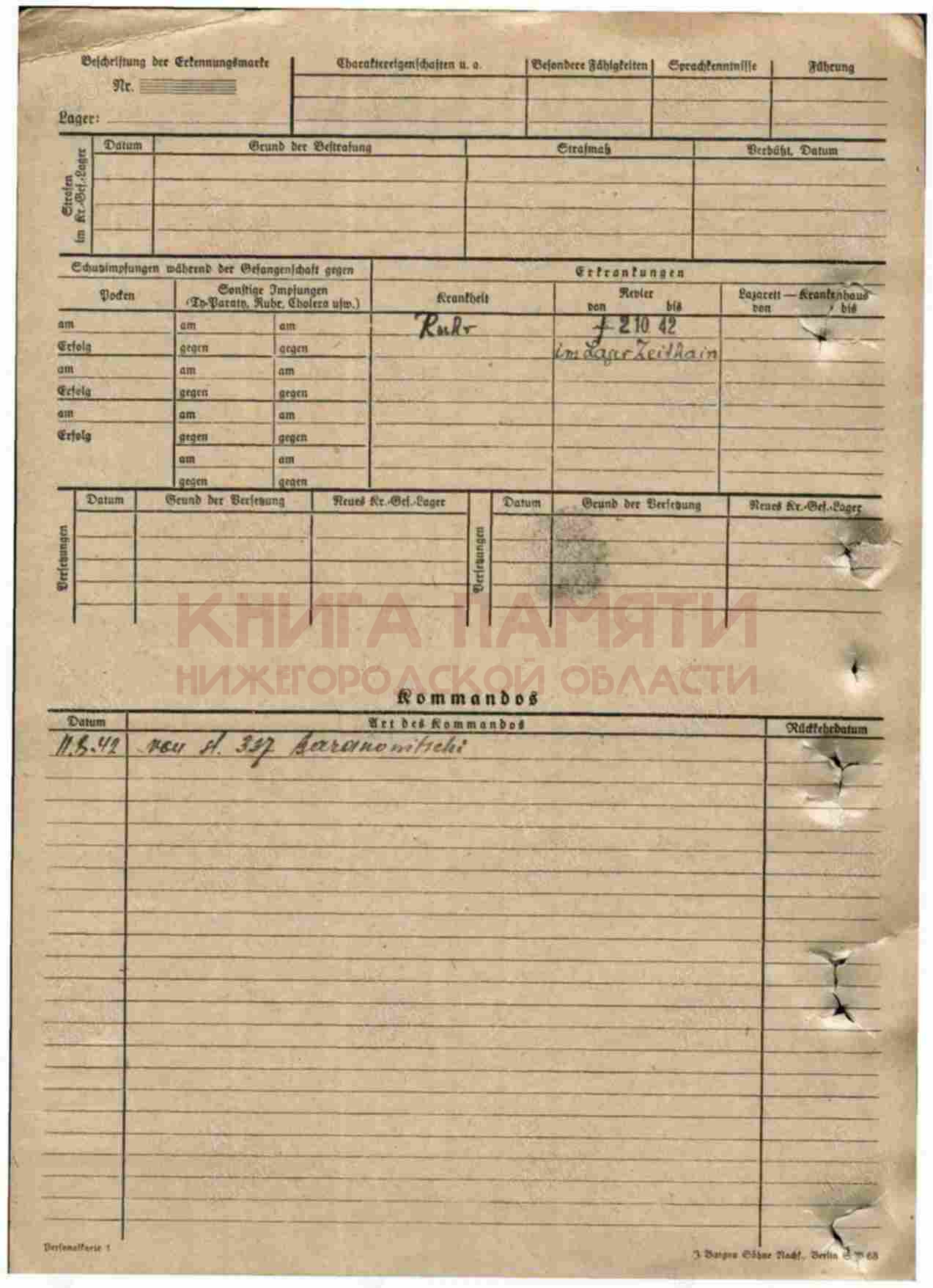 Погиб в плену в 1942 г., место пленения: Могилев, лагерь шталаг IV H (303), номер 41124, дата пленения: 28.07.1941,