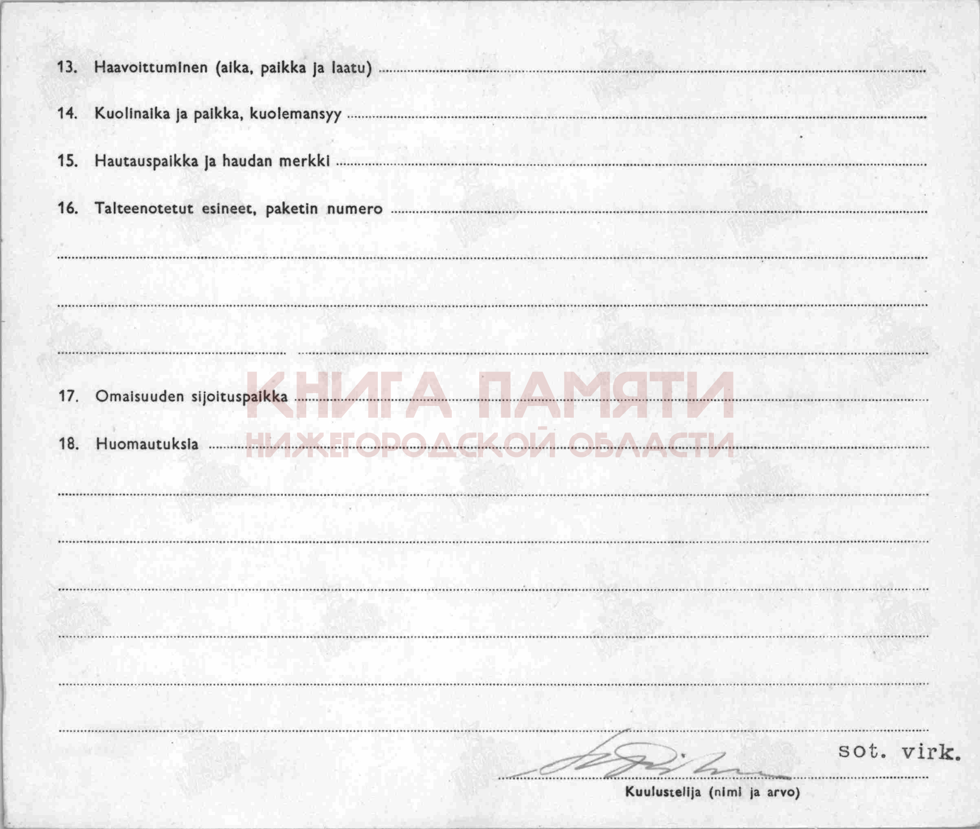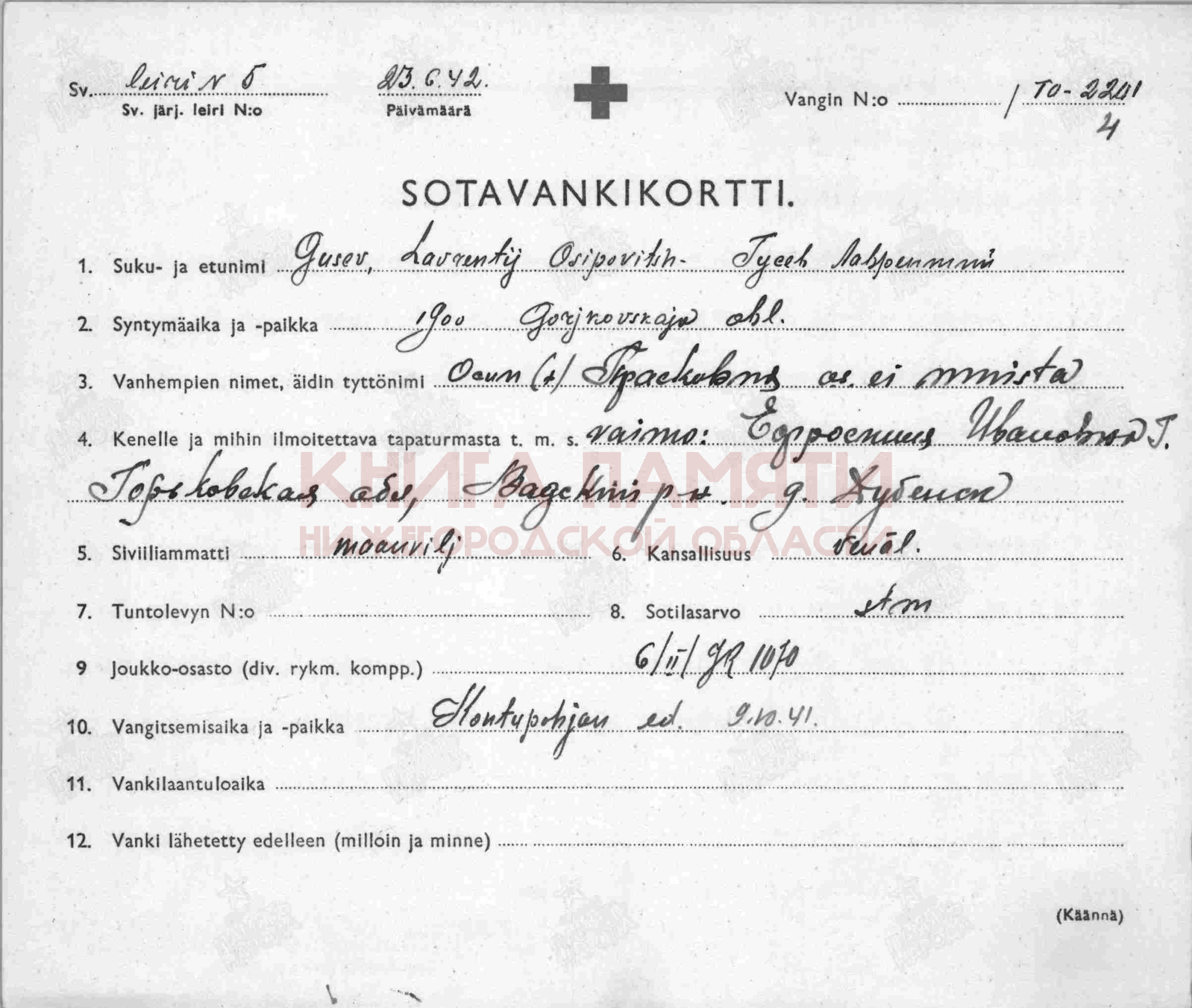 Попал в плен, 16.10.1941, Карело-Финская ССР, Лагерь: Лагерь № 5, Шотозеро-Эссойла-Петрозаводск, место пленения: Карело-Финская ССР, Кондопожский р-н, г. Кондопога