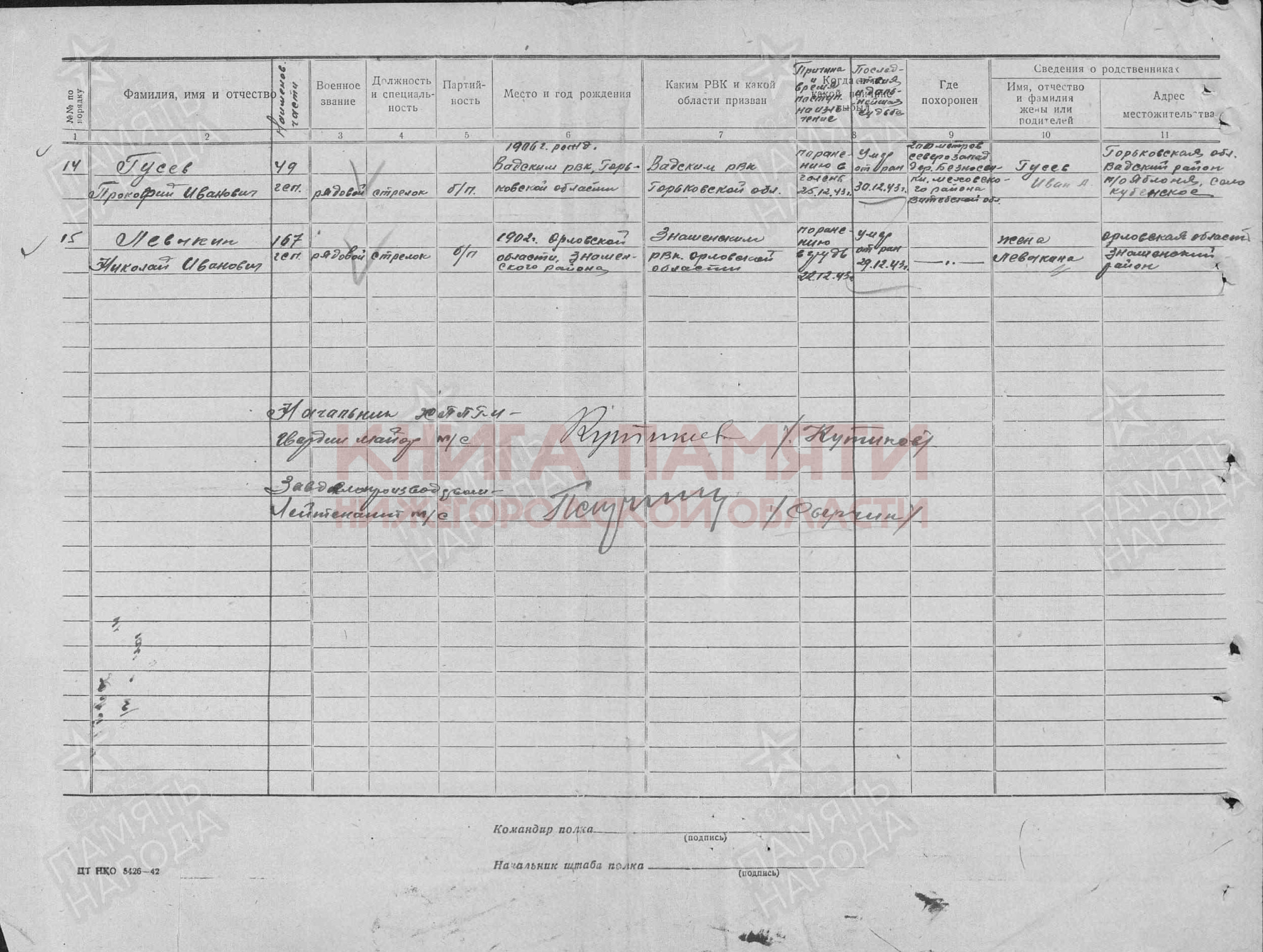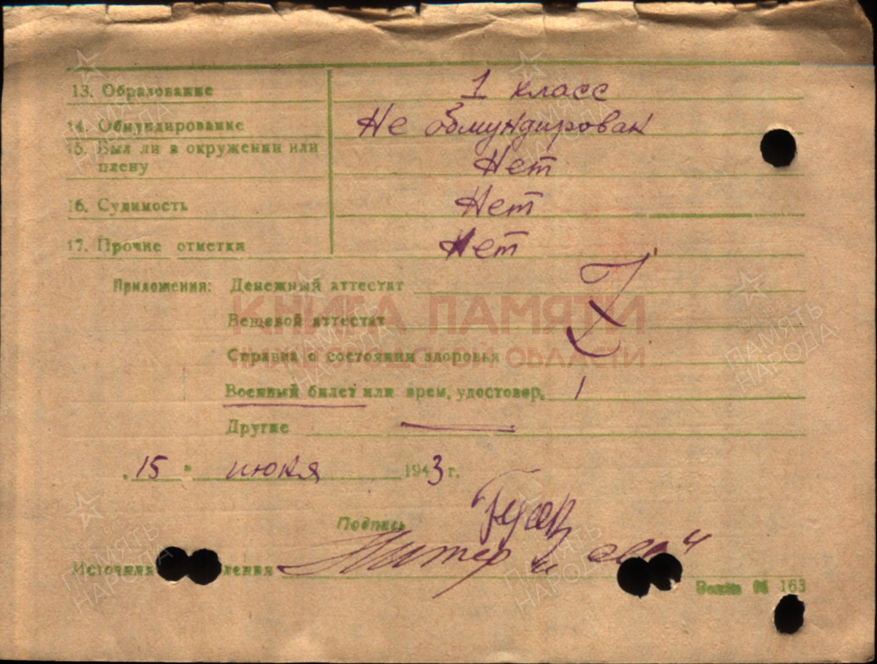 Похоронен: Белорусская ССР, Витебская обл., Меховский р-н, д. Безносенки, северо-западнее, 200 м.