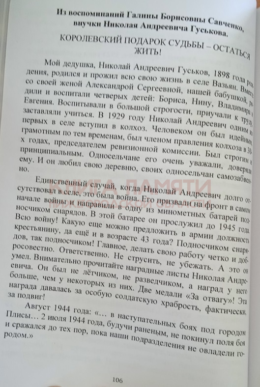 Для неё он Коля. Шестьдесят лет они прожили рука об руку. А для меня он Николай Андреевич Гуськов, восьмидесятилетний односельчанин, участник гражданской и Великой Отечественной, строитель автозавода, организатор одного из первых колхозов в этих местах и коммунист, о принципиальности и прямоте которого ходили по селу легенды.