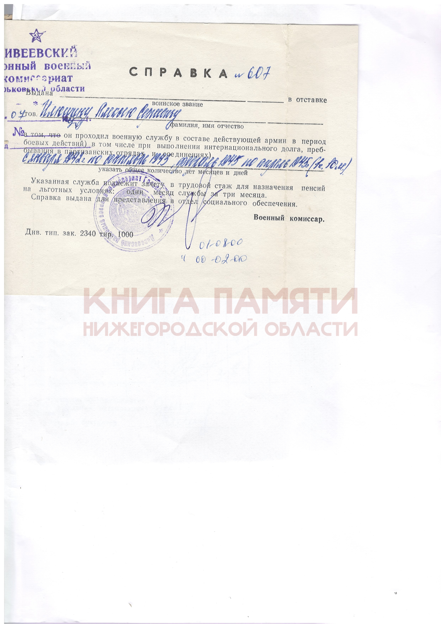 Инвалид ВОВ 3 группы. Был ранен __.04,1945г., ранение правого коленного сустава с повреждением бедра. Проживал в с.Суворово Дивеевского района. Умер 21.07.2001г.