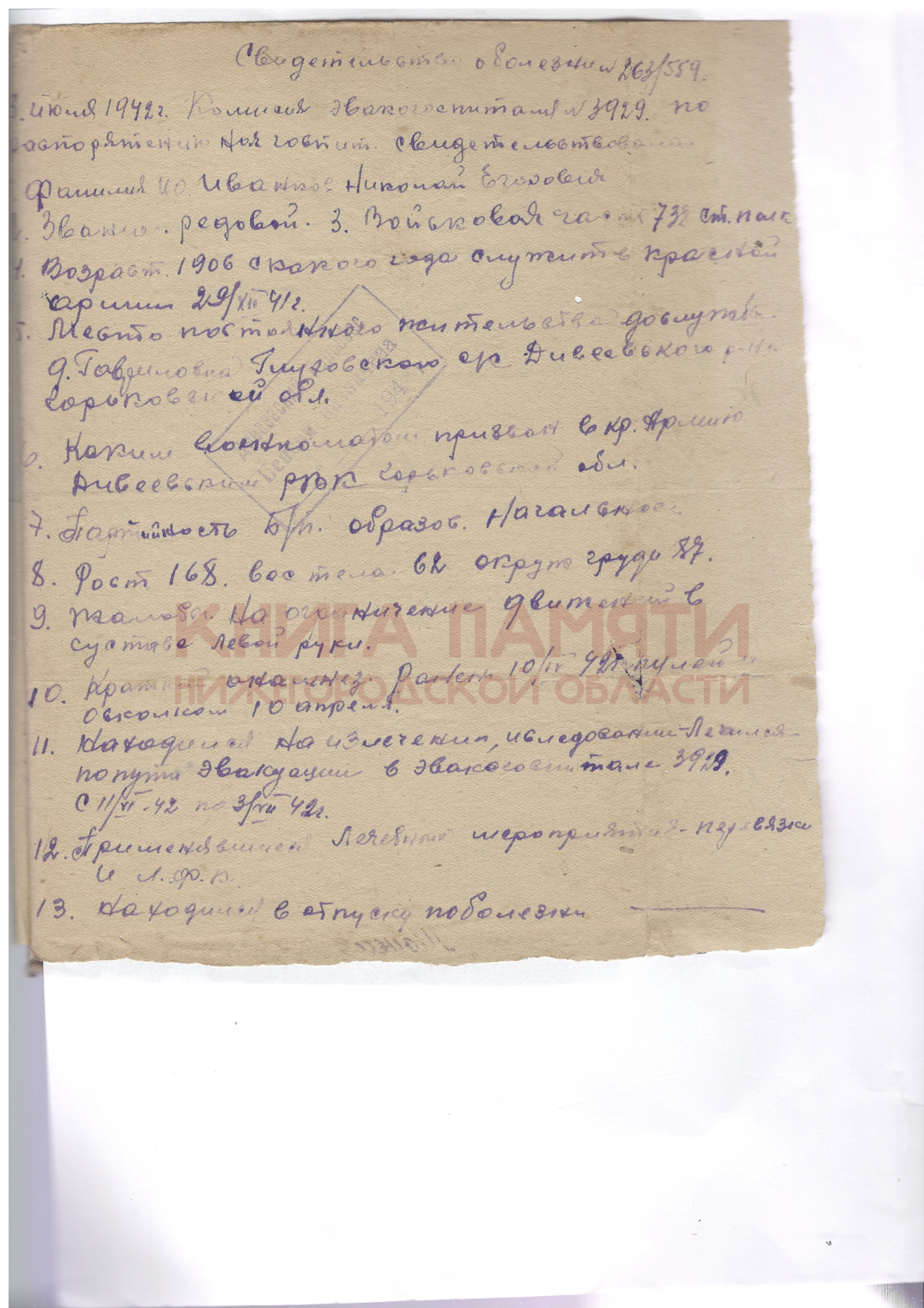 Инвалид ВОВ з группы. Был ранен 10.04.1942г. В левую руку, находился на излечении в ЭГ 3929 с 11.06.1942г. По 03.07.1942г. Проживал в д.Гавриловка Дивеевского района. Умер 13.08.1966г.