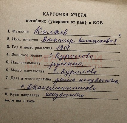 Родился в 1914г. в с.Курилово. Мобилизован на фронт Дальнеконстантиновским РВК, дата не известна. На фронте был рядовым солдатом. Пропал без вести в мае 1941г. Место службы не известно. Жена Калаева Н.И., проживала в с.Курилово.