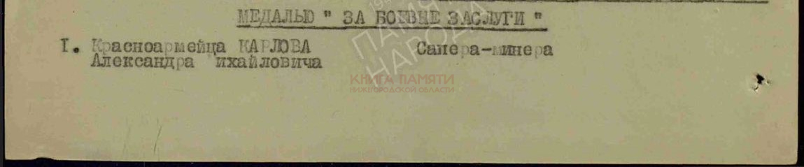 Уроженец села Малая Пица Дальнеконстантиновского р-на. До войны работал в колхозе "КИМ". Был призван на фронт 24.06.1941г. Служил в звании старшего сержанта, в 32 инженерно-саперной ордена Кутузова бригаде, командир отделения. Воевал на 3 Белорусскиом фронте. За образцовое выполнение боевых заданий командования, награжден орденом "Отечественной войны" 2 ст. в ноябре 1944г. Погиб 25.01.1945г. Похоронен в Восточной Пруссии. Жена Карлова Татьяна Михайловна, сын Карлов Николай Александрович, 1934г., сын Карлов Анатолий Александрович, 1936г., проживали в с.Малая Пица.