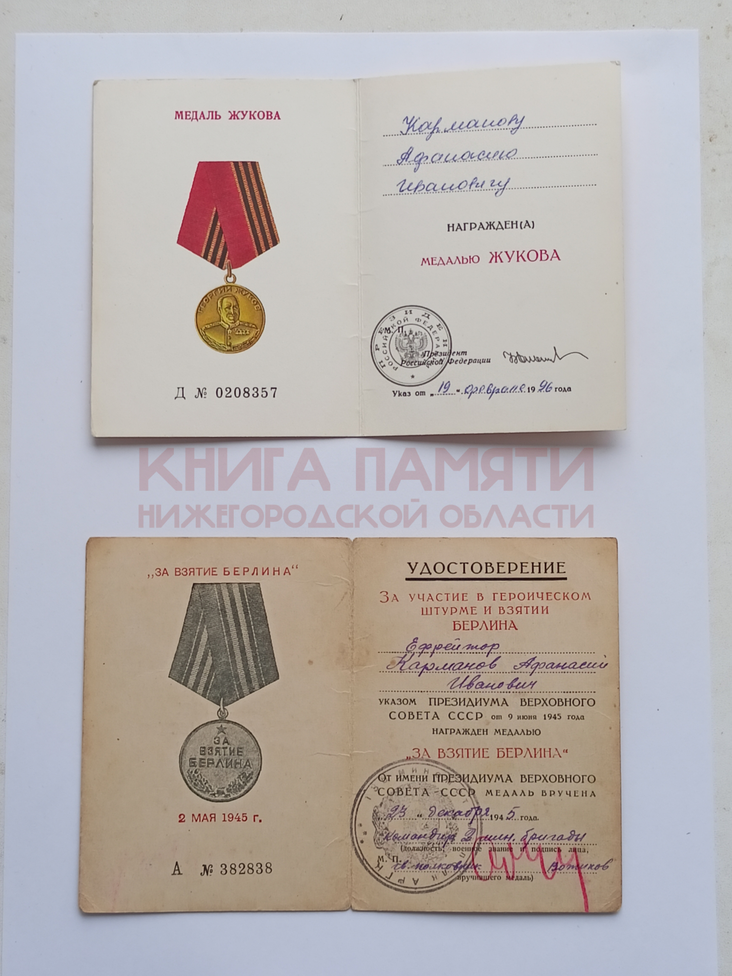 На момент войны Карманову Афанасию Ивановичу  не было и 18 лет.Он был призван в Армию в 1942 году. Был специалистом полевых кабельных линий,командиром отделения.Дошёл до Берлина. Получил множество благодарностей от Верховного Главнокомандующего маршала Советского Союза И.В.Сталина.Был награждён правительственными наградами:орденами и медалями за боевые заслуги.В 1942 году был уволен в запас.Вернулся в родной колхоз.Здесь встретил свою судьбу: Евдокию Александровну Ефремову.Родили и воспитали 7 детей.Афанасий Иванович работал плотником ,затем бригадиром полеводческой бригады.За трудовые успехи был 2 раза в Москве на ВДНХ. Несмотря на тяжёлые испытания в жизни Афанасий Иванович сохранил жизнелюбие,оптимизм.Был добрым и миролюбивым человеком.Старался каждому помочь,кто в этом нуждался.По воспоминаниям, был весёлым и любил играть на гармошке. Ушёл из жизни  Афанасий Иванович 14 июня 1999года в возрасте 75 лет.