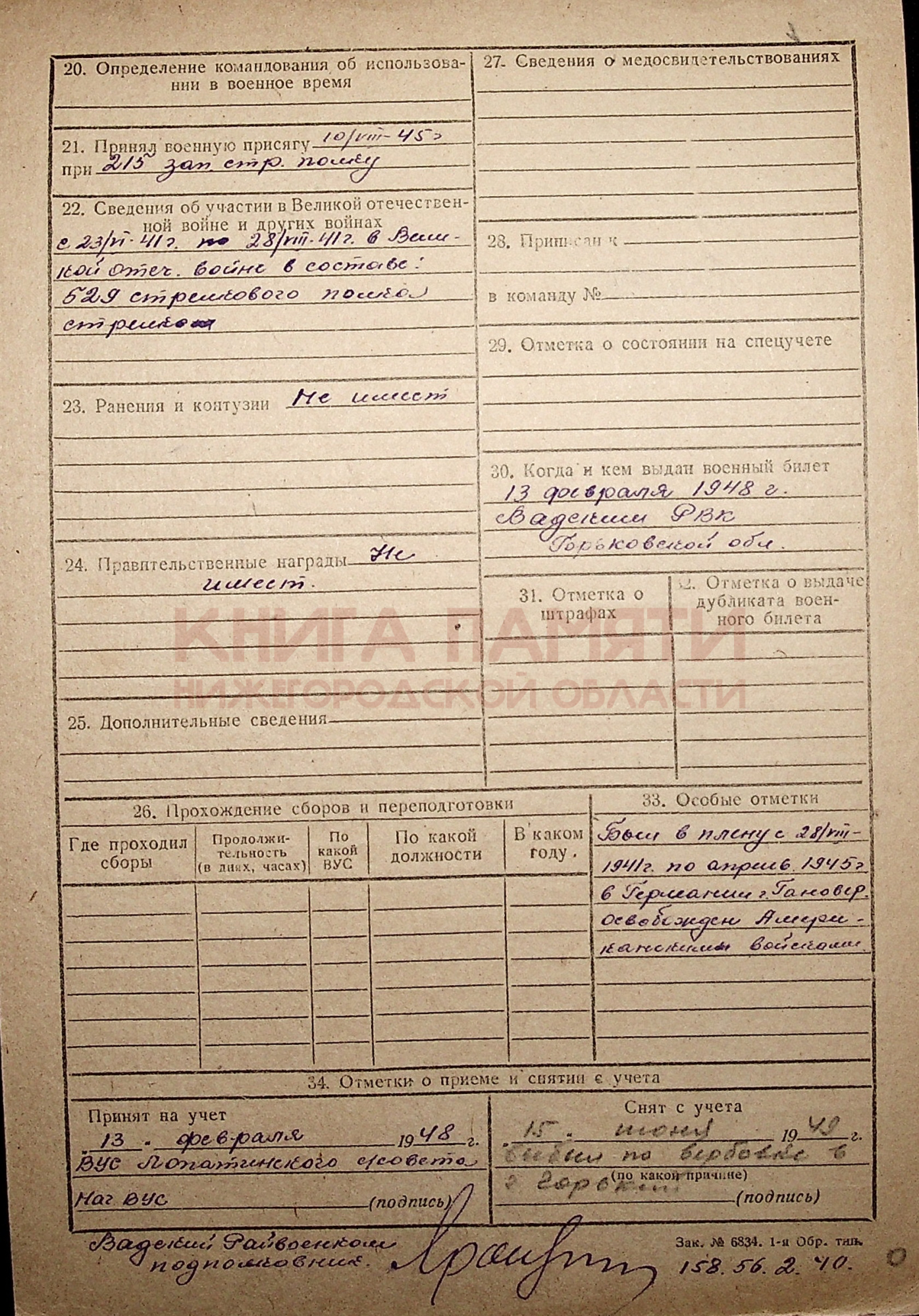 С 28.08.1941 по апрель 1945 был в плену в Германии г. Гановер