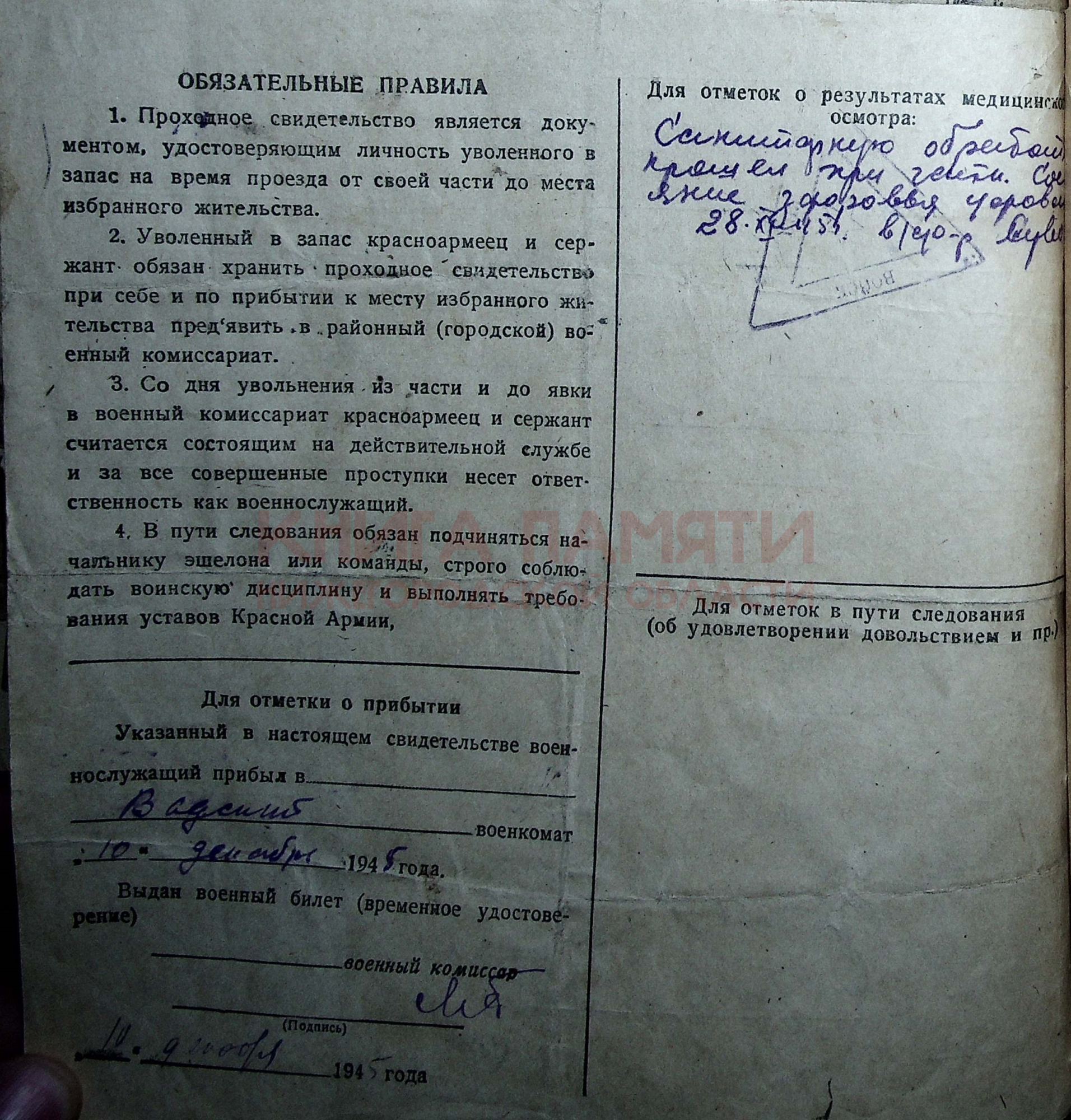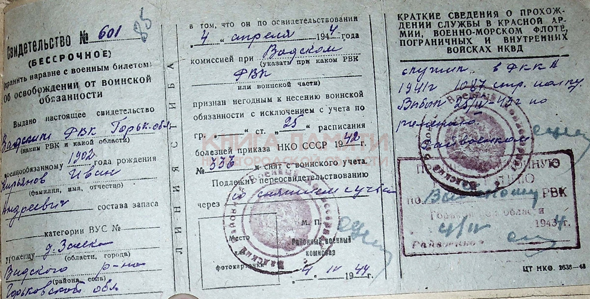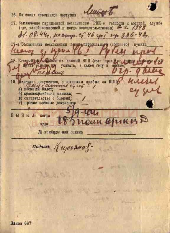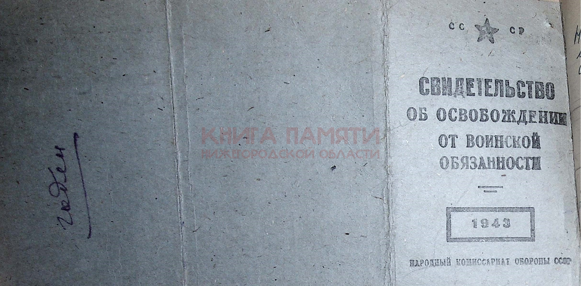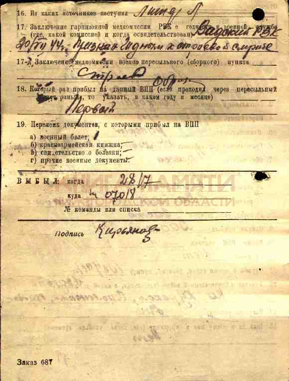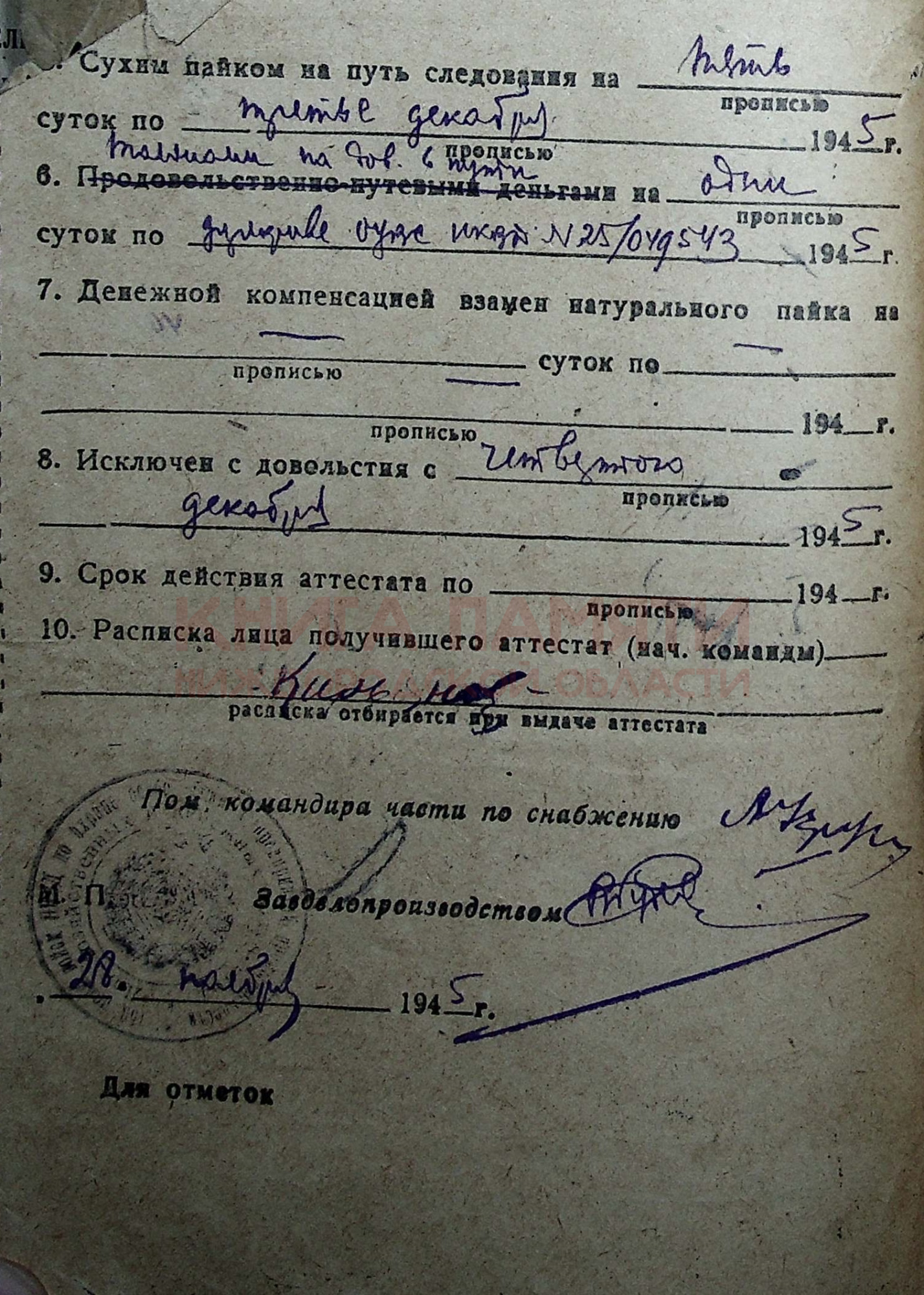 Выбыл 25.04.1943 по ранению. 4.04.1944 по освидетельствовании признан негодным к несению воинской обязанности с исключением с учета и снят с воинского учета.