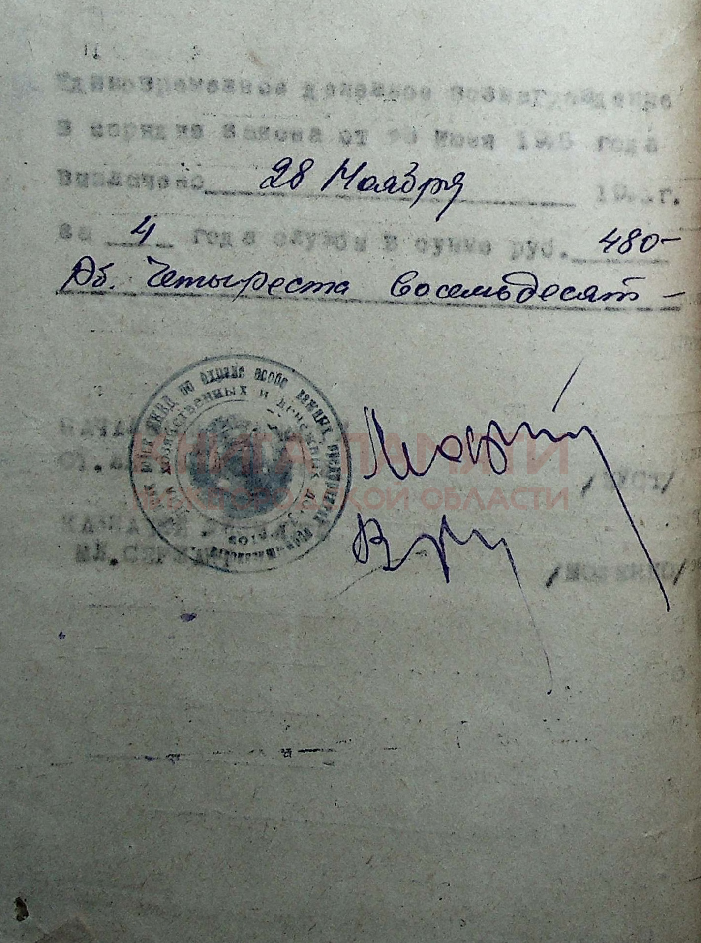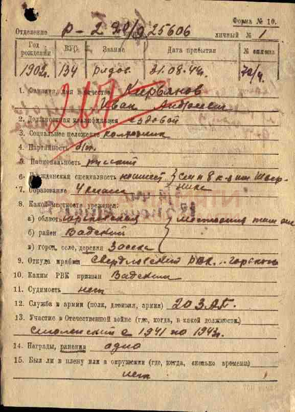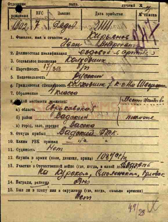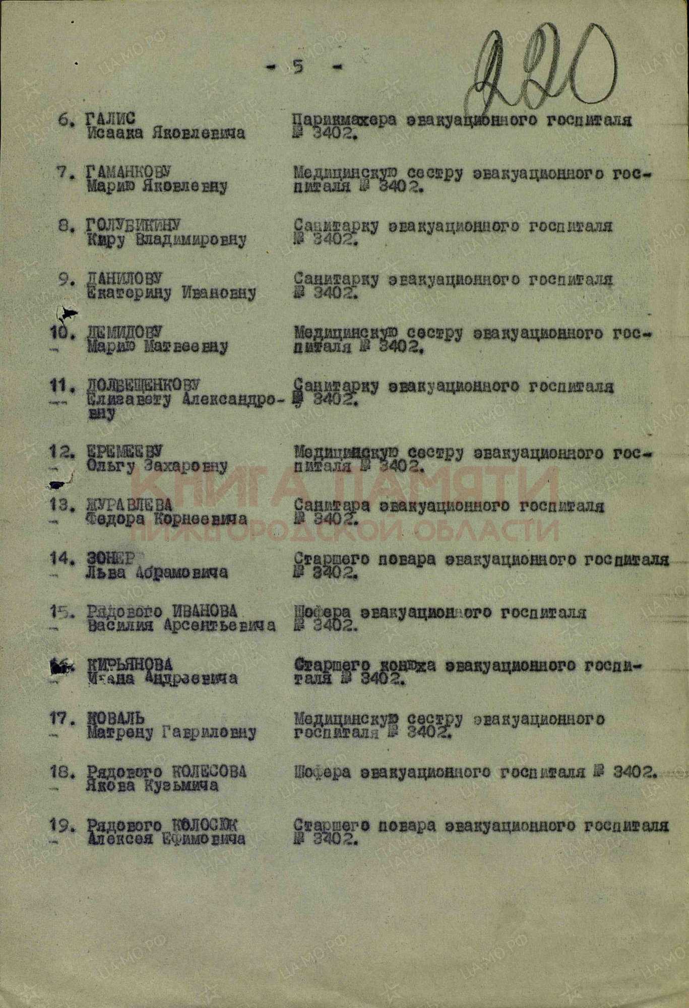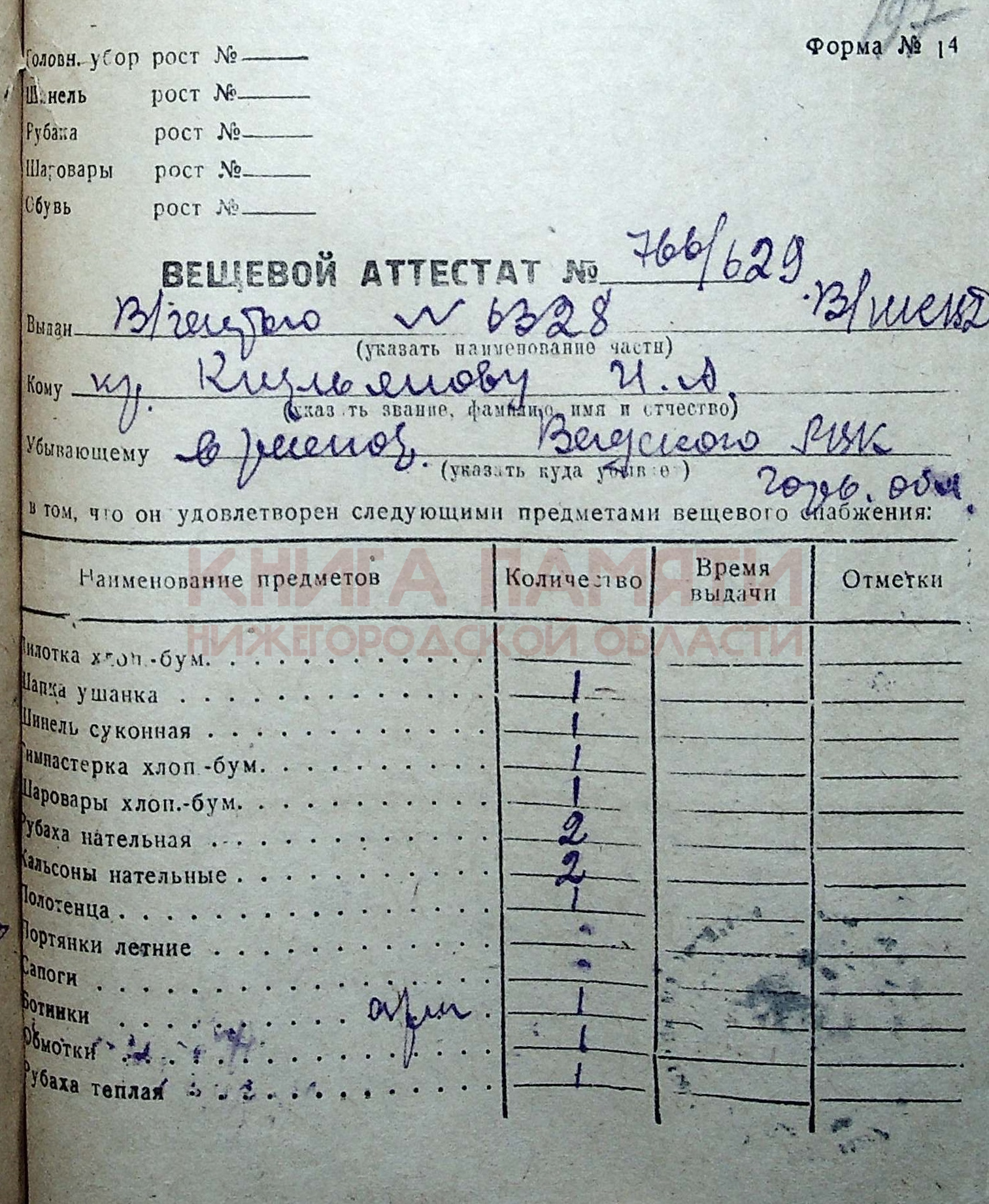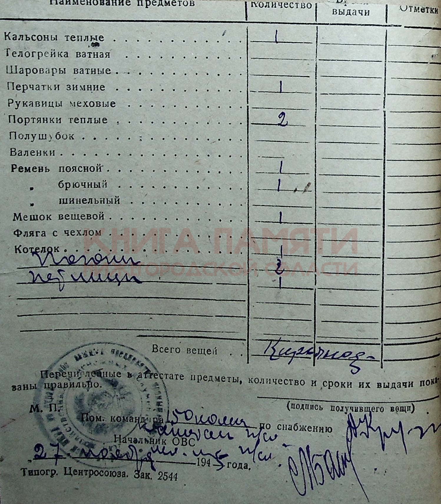 Выбыл 25.04.1943 по ранению. 4.04.1944 по освидетельствовании признан негодным к несению воинской обязанности с исключением с учета и снят с воинского учета.