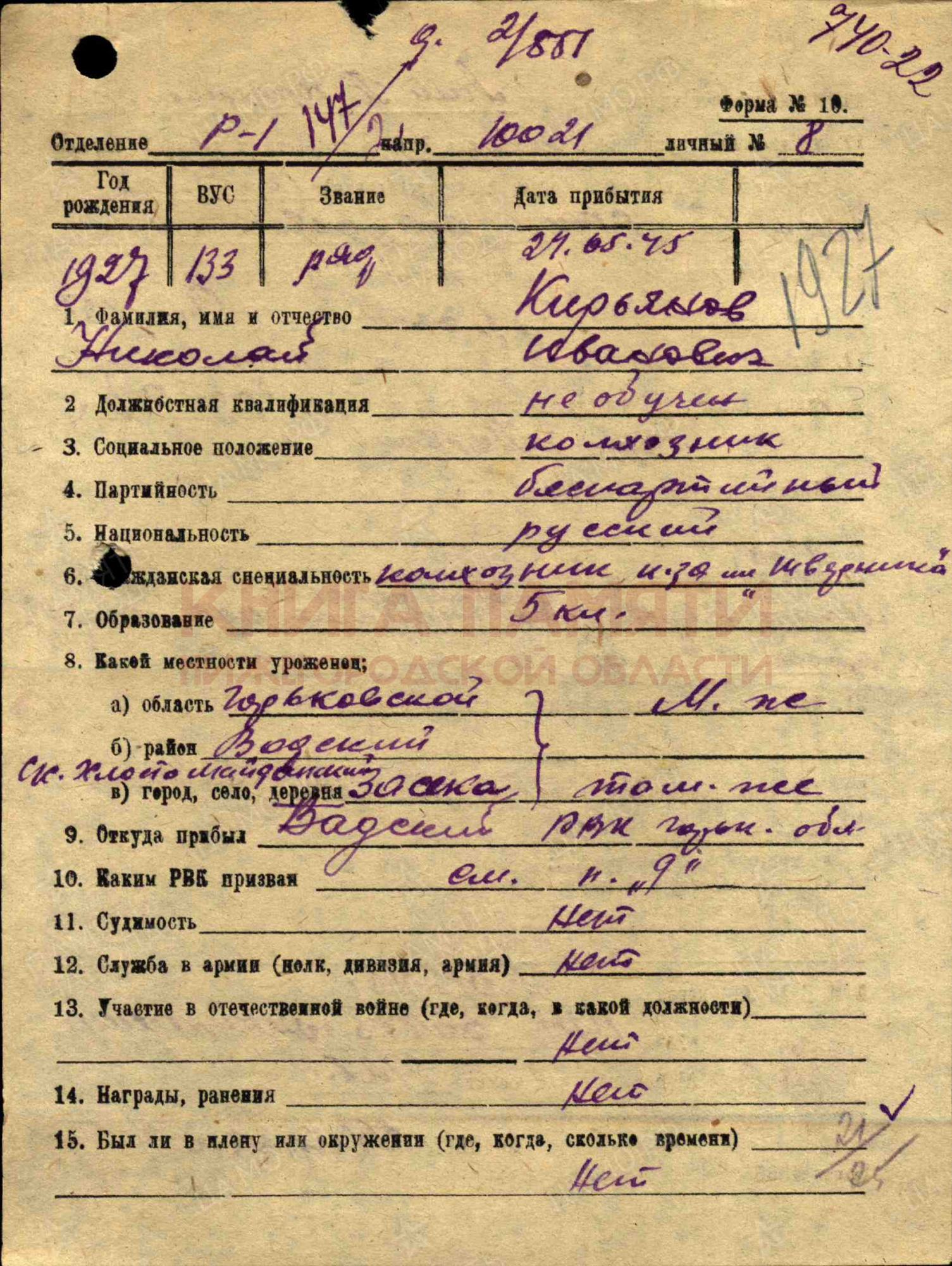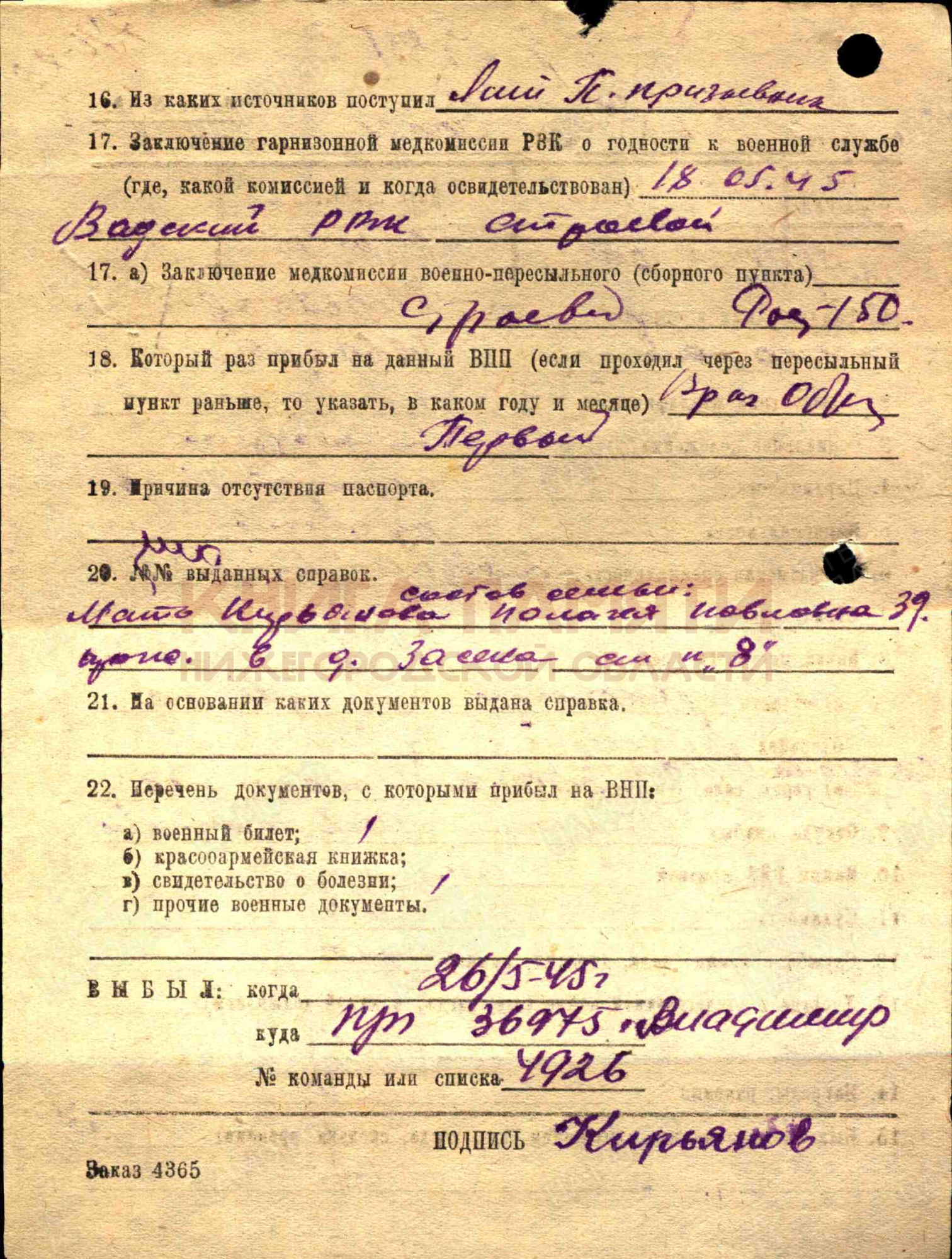 18.05.1945 годен к строевой военной службе. Уволен в запас 11.08.1951