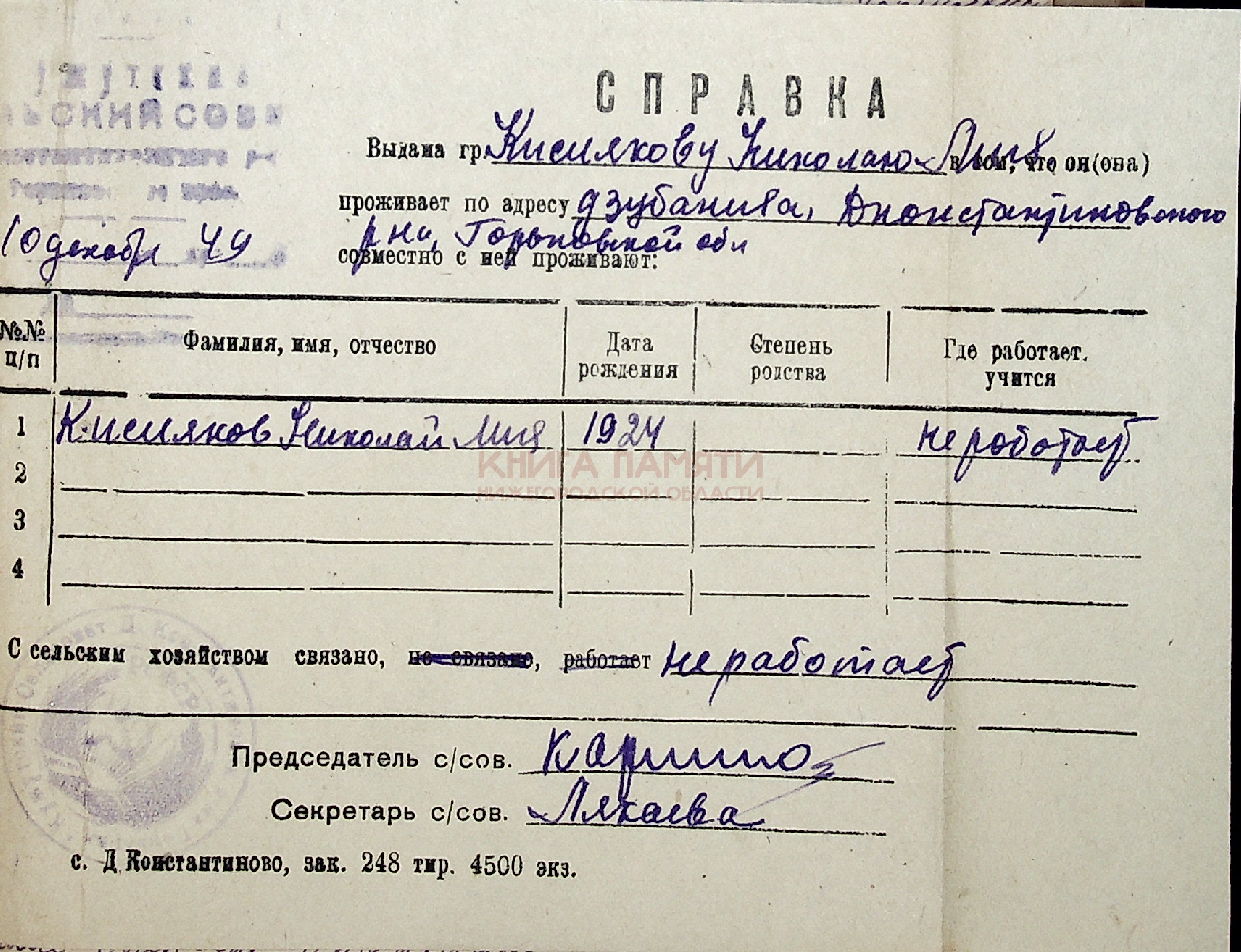 До призыва на фронт работал в колхозе "Двигатель революции" , призван на фронт Дальнеконстантиновским РВК в 1942г. На войне был в звании сержанта, по состоянию здоровья снят с воинского учета в 1946г. После войны проживал в д. Зубаниха. Умер 26.08.1951г.