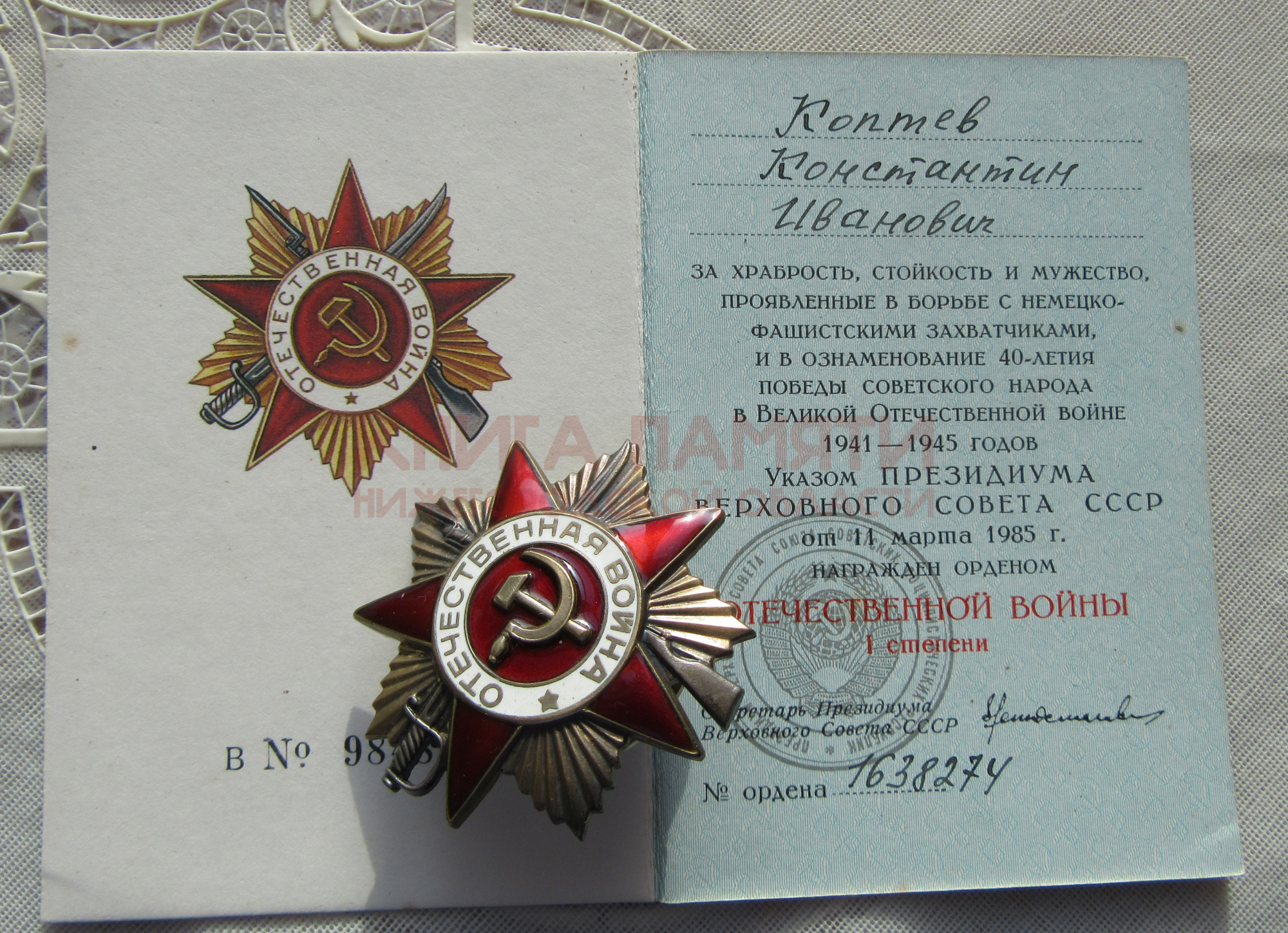 Хорошо налаженная телефонная связь во время войны— залог благополучного исхода боя, залог победы. Со своим отделением отец устранял обрывы телефонного кабеля, поврежденные от взрывов, работая на передней линии фронта. Он вспоминал, как по приказу командира, когда связь прекращалась, а снаряды летели, разрываясь совсем близко, нужно было найти порыв и устранить его. Преодолевая страх, перебежками, от одной воронки к другой, нужно было умудриться не попасть под пули и выполнить задание. В наградном листе читаю: «Сержант Коптев К.И. командир отделения линейного взвода. Работая в аварийной бригаде на узле связи фронта с 20.03 — 09.04.1945 года со своим отделением устранил 60 случаев повреждения линий связи. В период наступательных боев по разгрому немецкой группировки в районе Кенигсберга восстанавливал порывы постоянной линии связи под обстрелом артиллерийского огня. Ранее работал на постройке постоянной линии связи вблизи переднего края немецкой обороны под обстрелом артиллерийского и минометного огня. Не смотря ни на что сержант Коптев К.И. продолжал работу и она была выполнена досрочно. Достоин правительственной награды ордена «Красная звезда. 16 апреля 1945 года» Отец не любил рассказывать про войну, но какие-то маленькие эпизоды рассказывал и они хорошо запоминались.