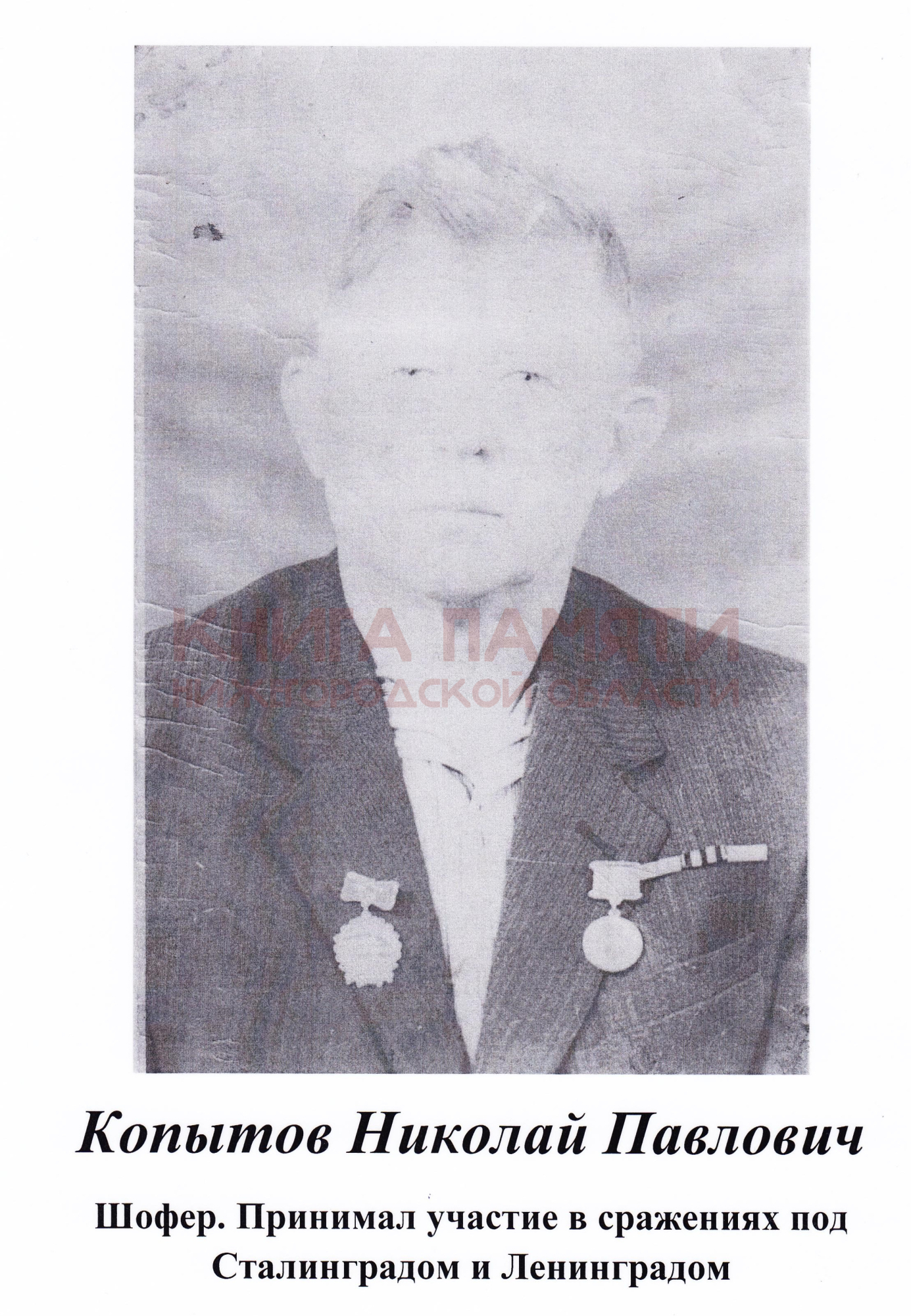 За проявленное мужество и стойкость солдат Николай Петрович Копытов награжден орденом Отечественной войны II степени, медалями «За боевые заслуги», «За оборону Сталинграда», «За победу над Германией в Великой Отечественной войне». За образцовое выполнение заданий, дисциплинированность и аккуратность в работе Николай Павлович награжден значком «Отличник-шофер».